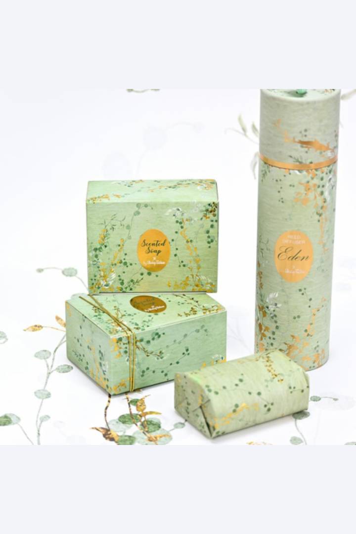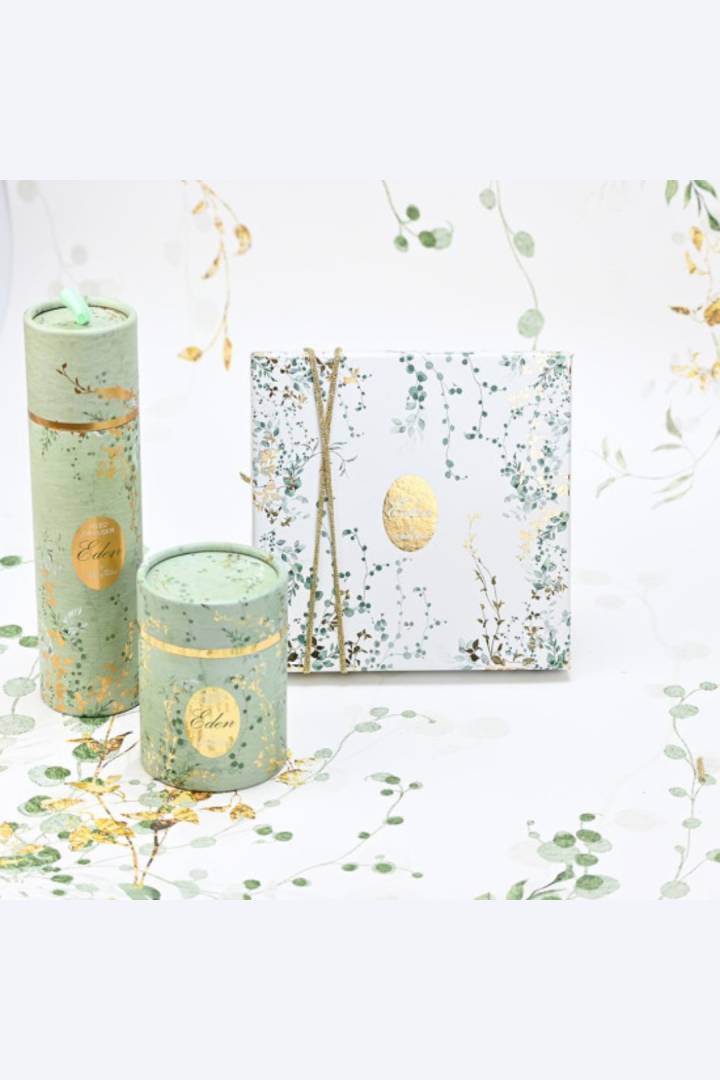 Η συσκευασία σε απαλούς πράσινους τόνους και χρυσές λεπτομέρειες αποπνέει φυσική κομψότητα και ηρεμία, καθιστώντας το ιδανική επιλογή για μπομπονιέρες γάμου και βάπτισης, καθώς και για προσεγμένα εταιρικά ή προσωπικά δώρα.