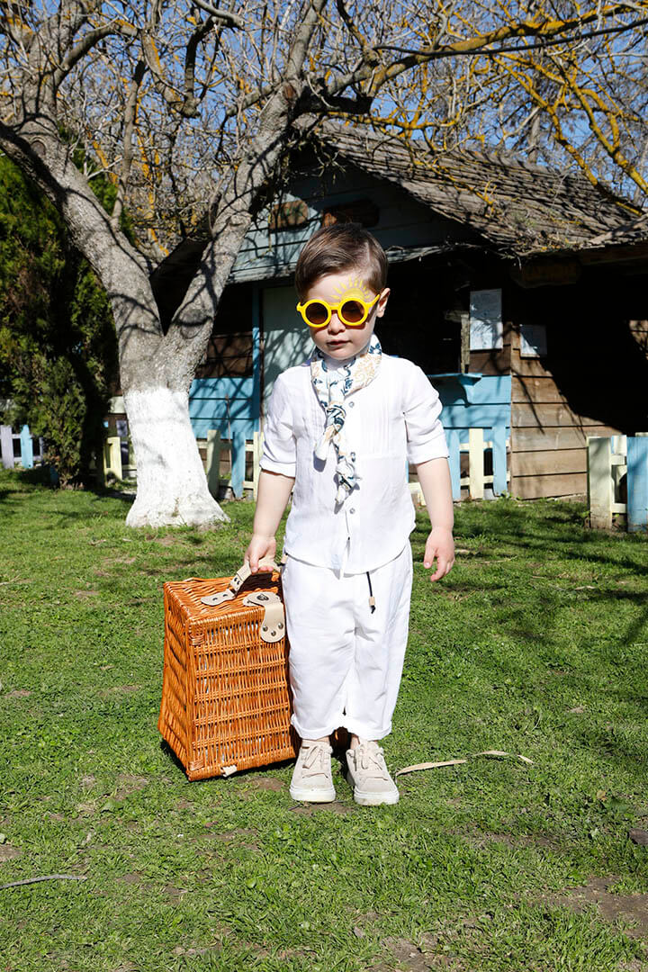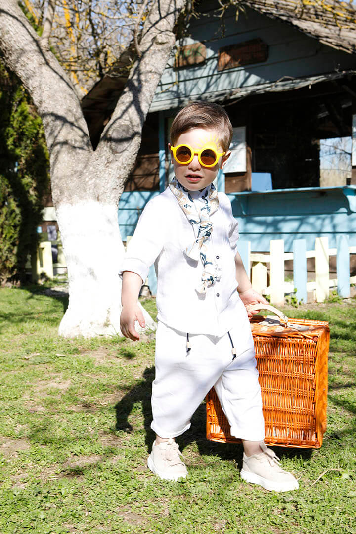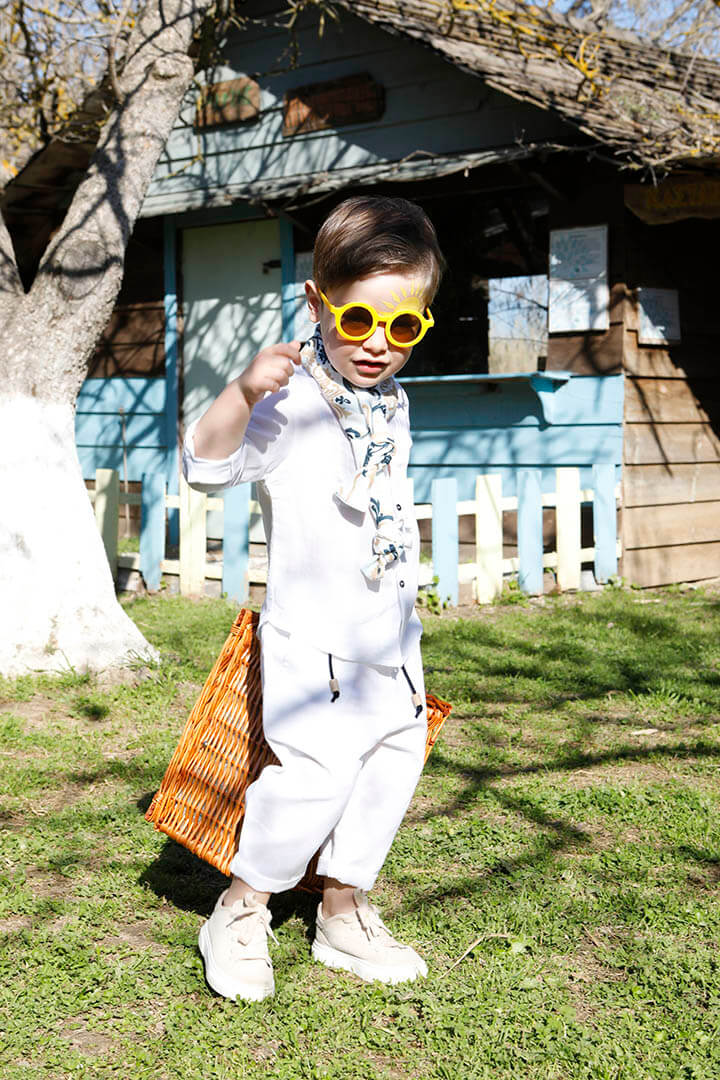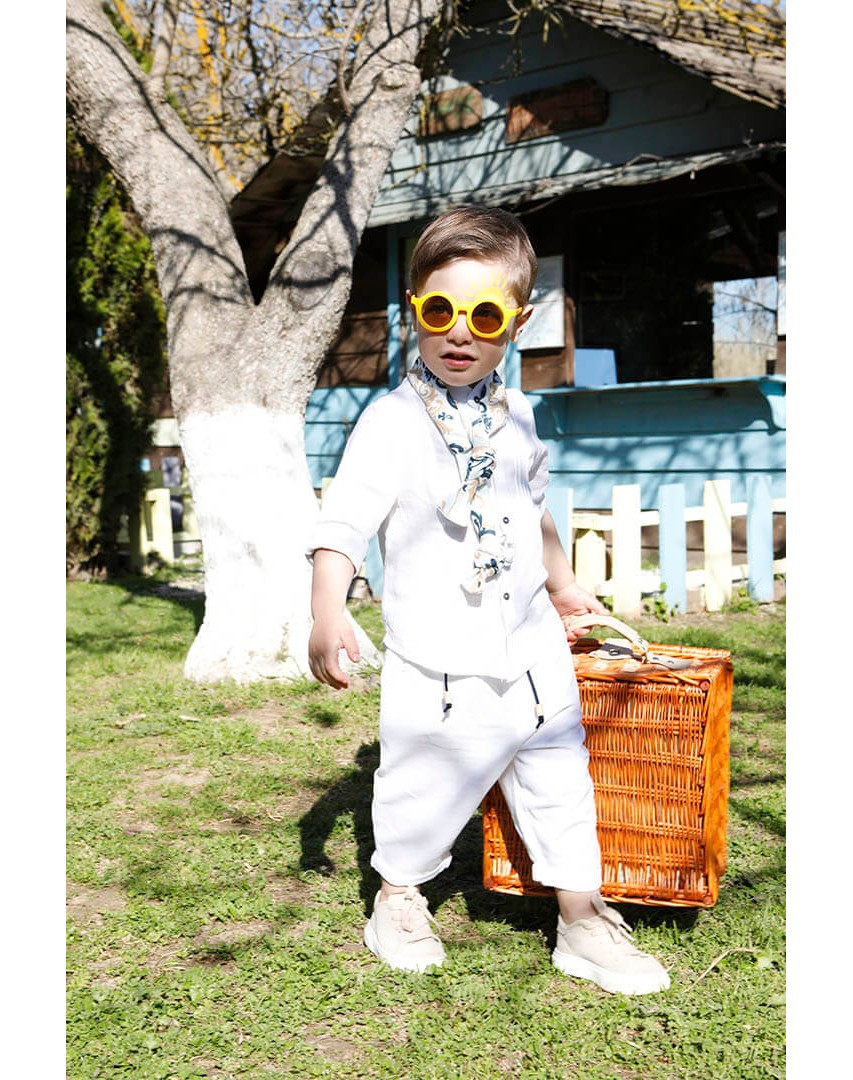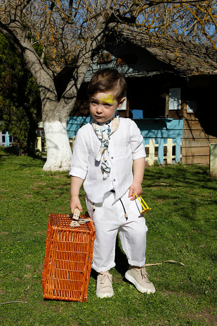 Ο Tony είναι ένα ολόλευκο σετ βάπτισης με μπλε και σιέλ λεπτομέρειες. Πουκάμισο με όμορφα νερβίρ από cotton γκοφρέ ύφασμα Γαλλίας. Παντελόνι λευκό 100% λινό. Δερμάτινη μπλε ζώνη. Φουλάρι σε χρωματισμό λευκό, μπεζ, σιέλ και μπλε από soft cotton 100%. Καπέλο λευκό με τρέσσα από φουλάρι.