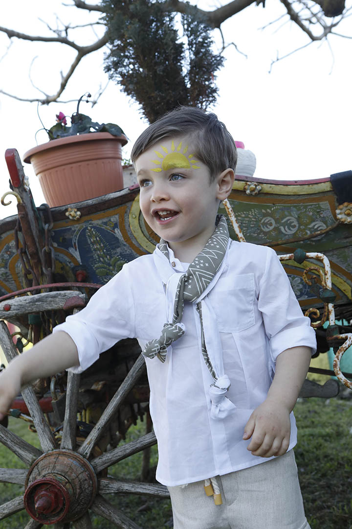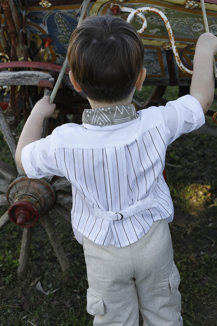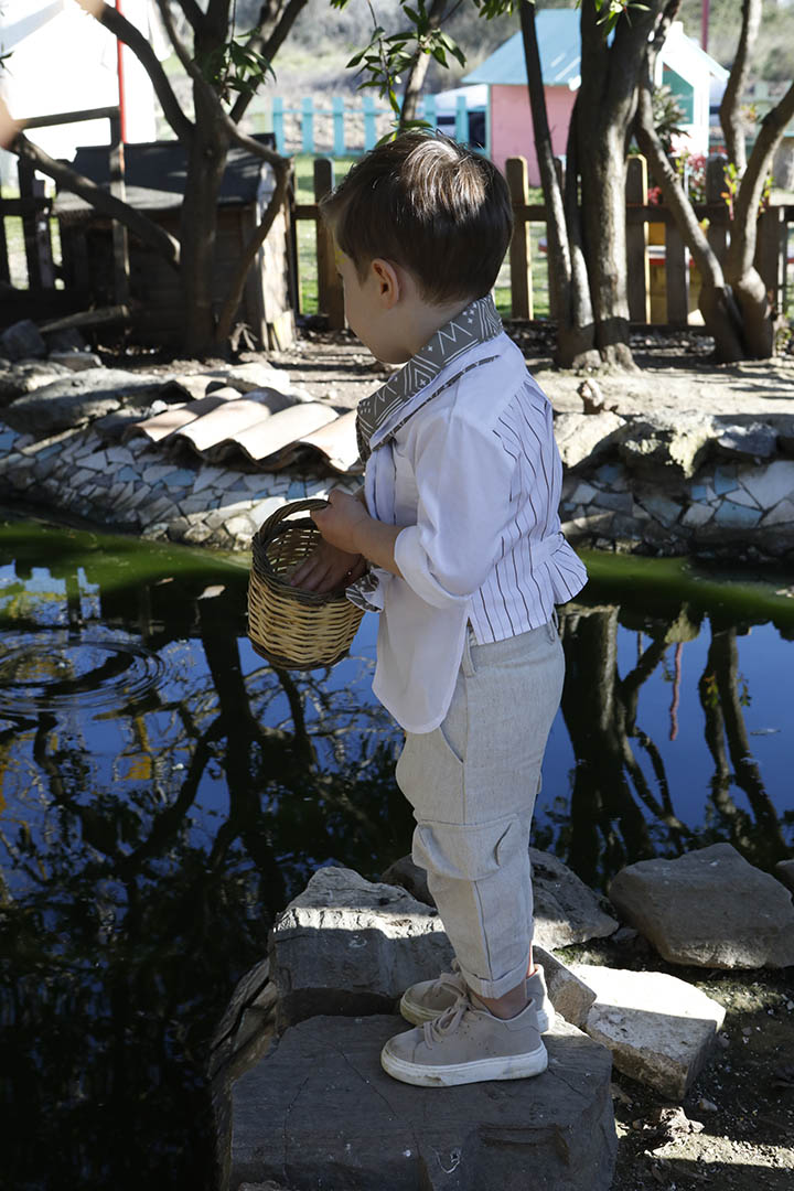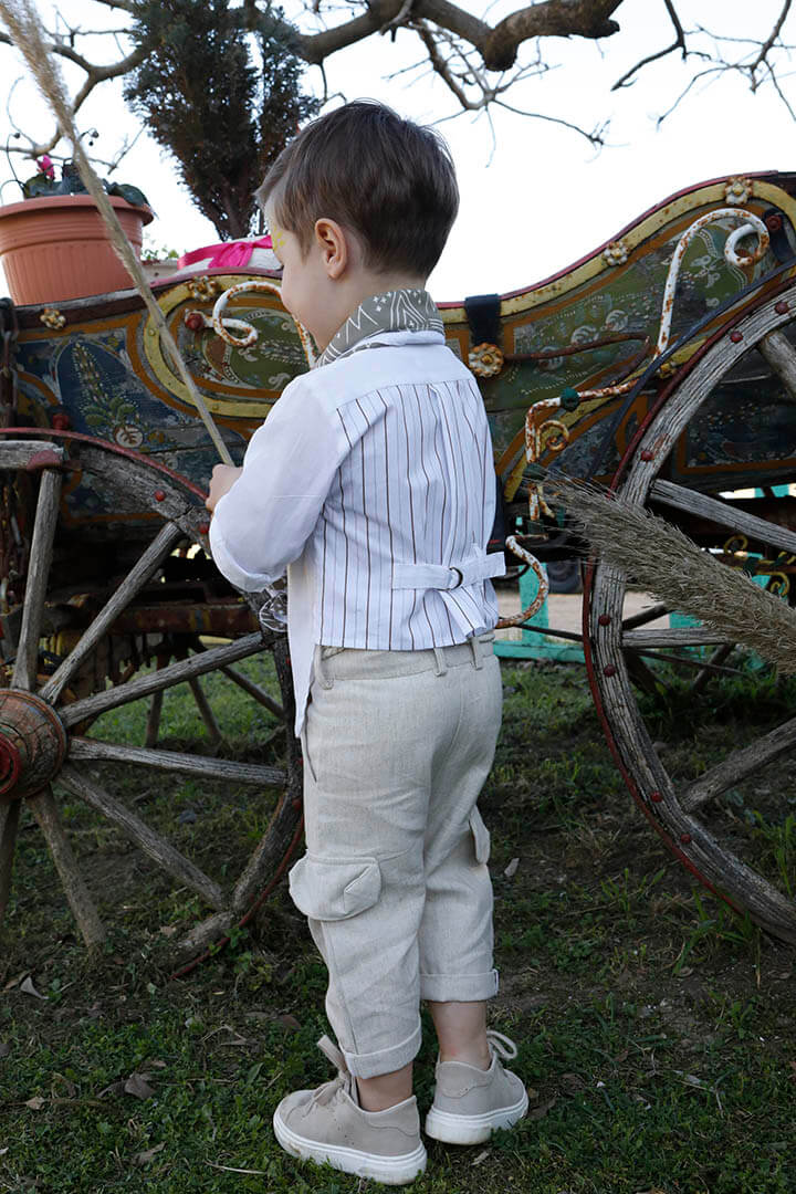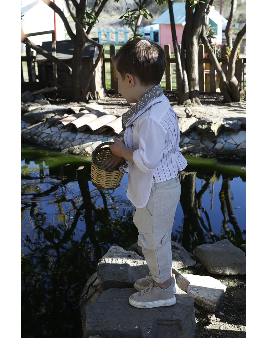 Ο Stathis είναι ένα ανάλαφρο σετ βάπτισης σε λευκό με μπεζ συνδυασμό. Πουκάμισο από 100% cotton λευκό ύφασμα σε συνδυασμό με 100% cotton λευκό με καφέ ρίγα ύφασμα στο πίσω μέρος. Παντελόνι μπεζ σε σχέδιο ψαροκόκκαλο από 100% linetta Ιταλίας. Εκρού κορδόνι για ζώνη. Φουλάρι σε καφέ με εκρού απόχρωση με printed pattern από soft cotton 100%. Καπέλο λευκό με μπεζ τρέσσα.