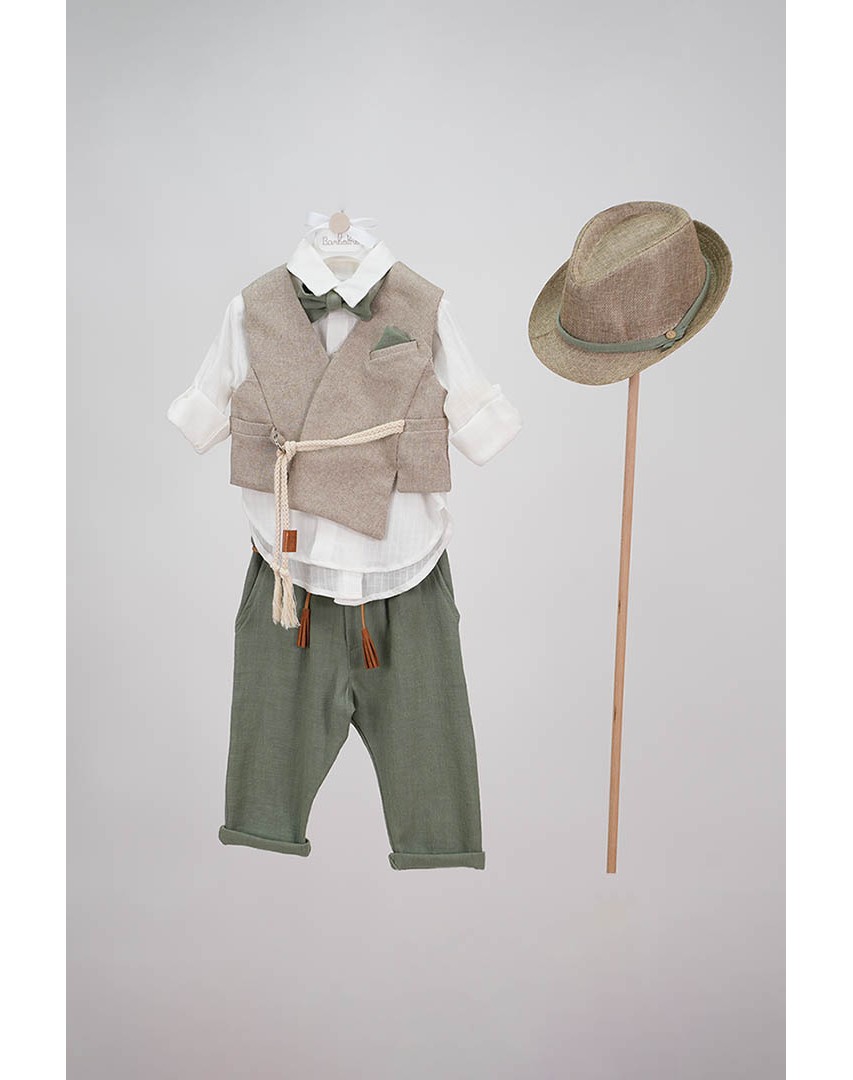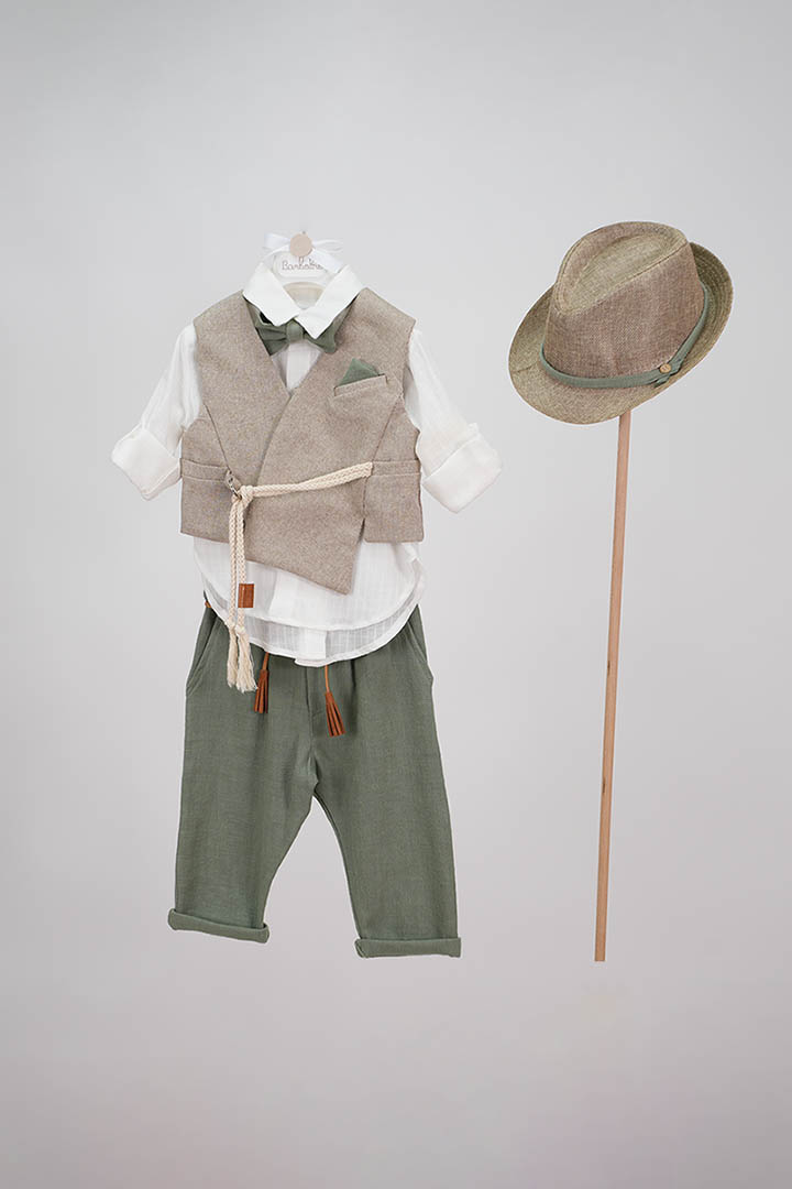 Ο Matias είναι ένας classic bambolino συνδυασμός με μοντέρνες λεπτομέρειες. Αποτελείται από μέντα παντελόνι με πιέτες, εκρού πουκάμισο με νταμάκια και μπεζ γιλέκο με ιδιαίτερο δέσιμο με κρίκο και κορδόνι. Αξεσουάρ είναι το ταμπά κορδόνι για ζώνη, το μέντα παπιγιόν, το μαντήλι και το καβούρι του.