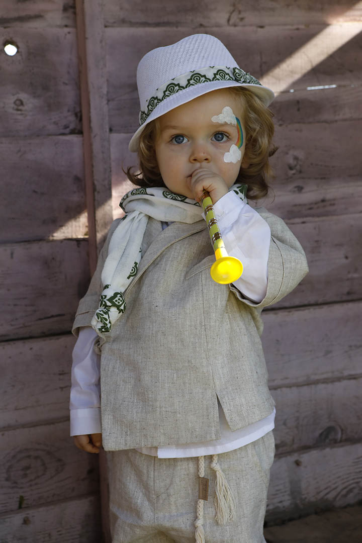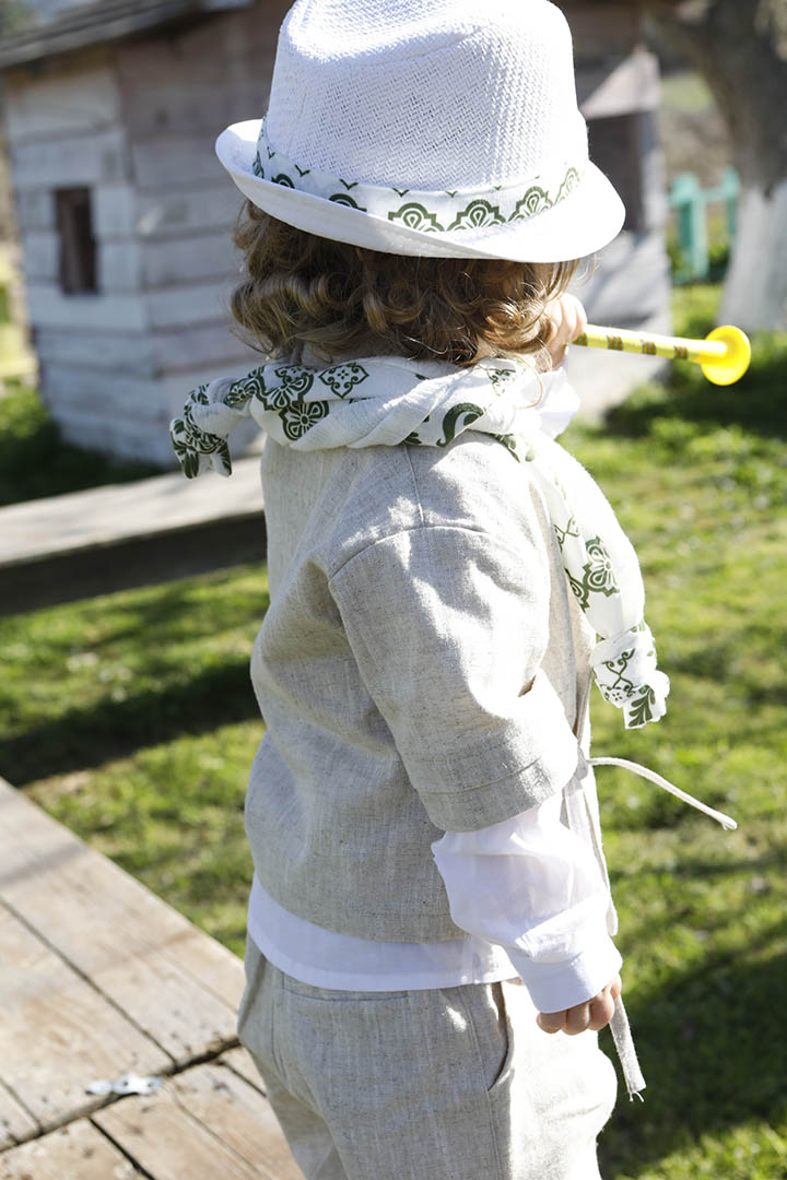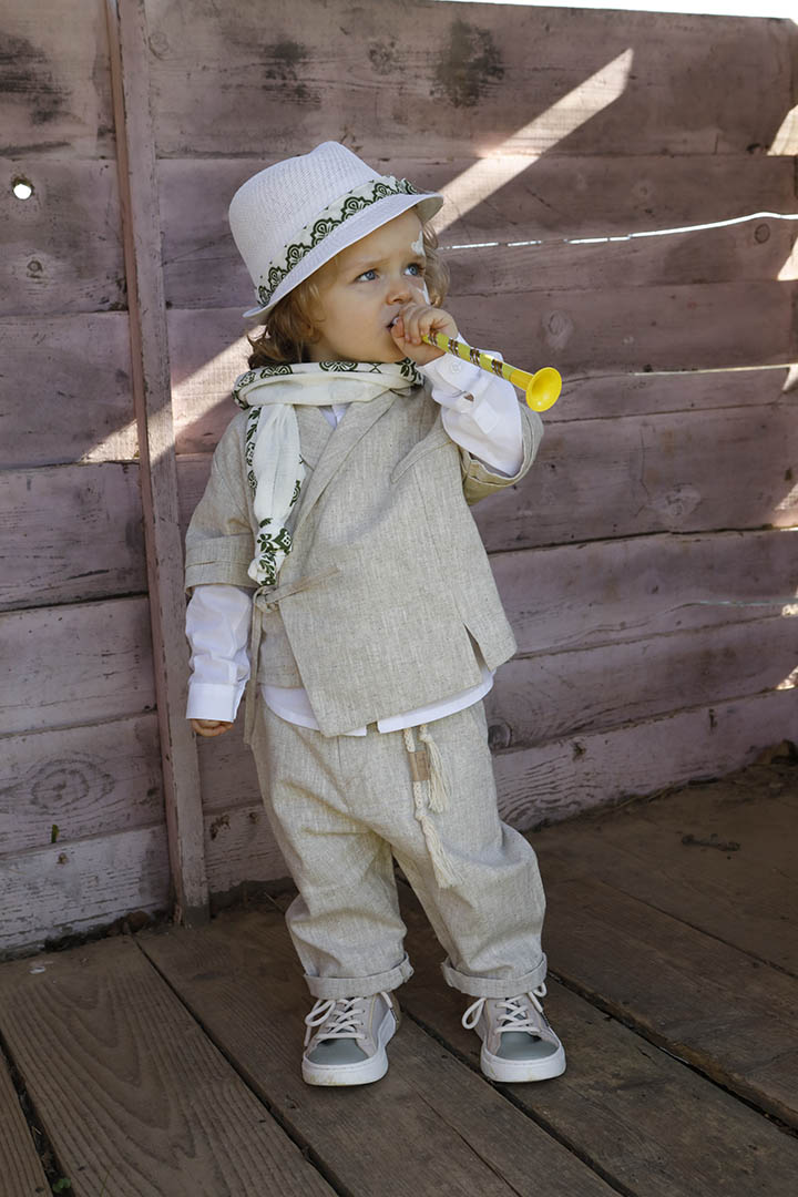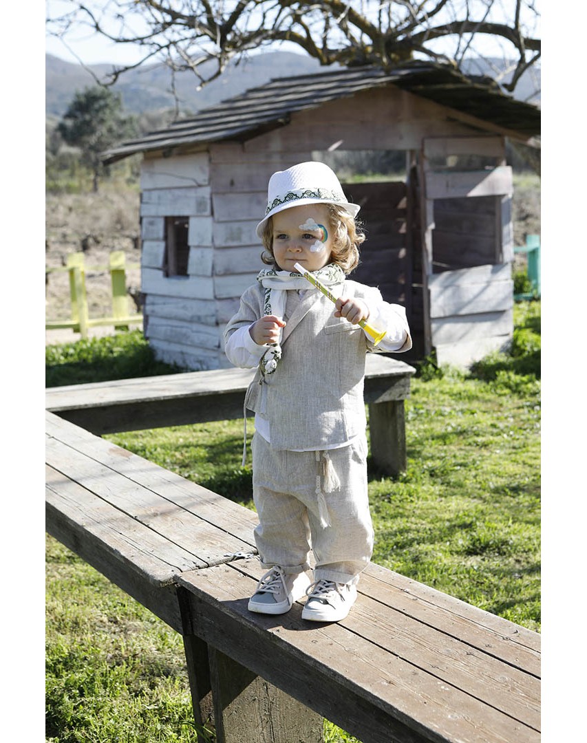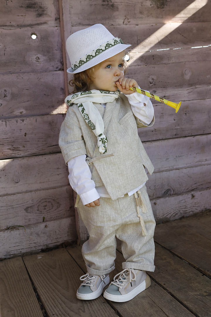 Ο Ivan είναι ένα μπεζ εκπληκτικό κοστούμι σε μία καινούρια εκδοχή για το πιο εντυπωσιακό σετ βάπτισης για το μωρό σας. Πουκαμίσα μπεζ κοντομάνικη με υπέροχα δεσίματα για ανάλαφρο στυλ σε 100% linetta. Παντελόνι ίδιο ύφασμα με την πουκαμίσα για απόλυτη αρμονία. Φουλάρι εκρού soft printed με μέντα σχέδιο και βαμβακερό κορδόνι για ζώνη. Καπέλο λευκό με τρέσσα απο το φουλάρι.