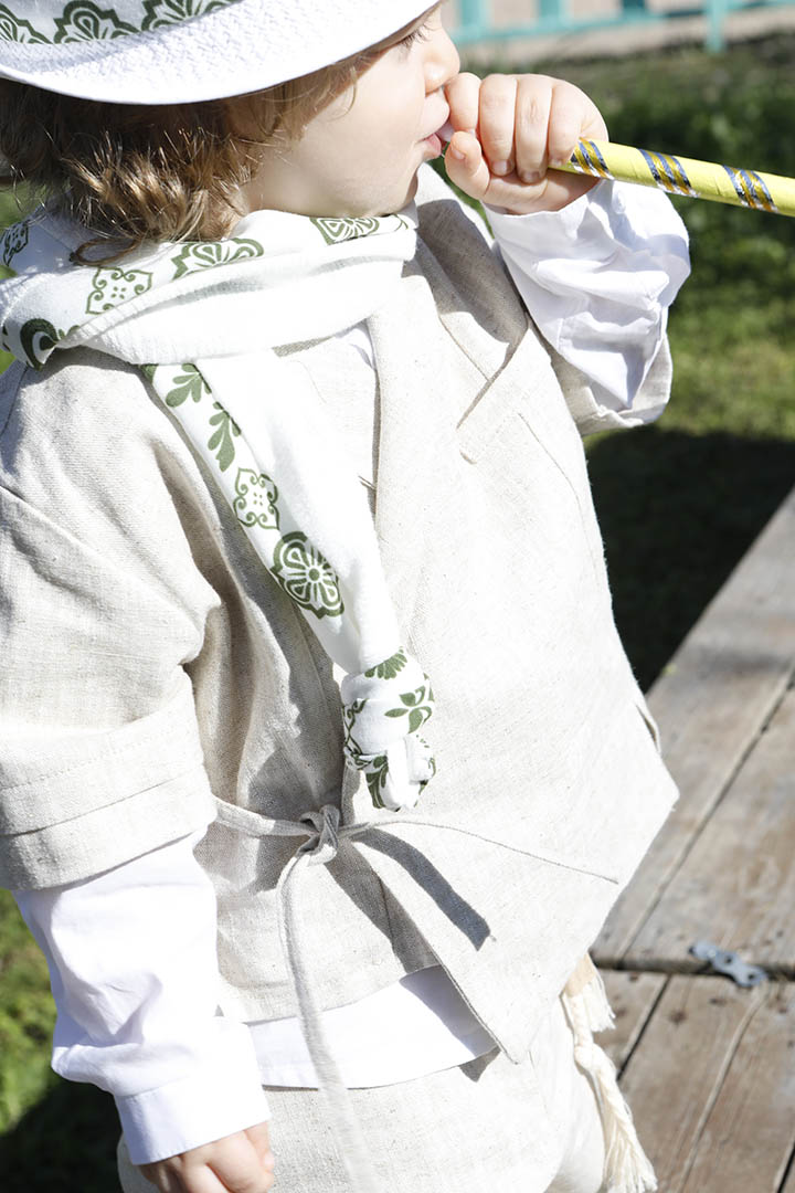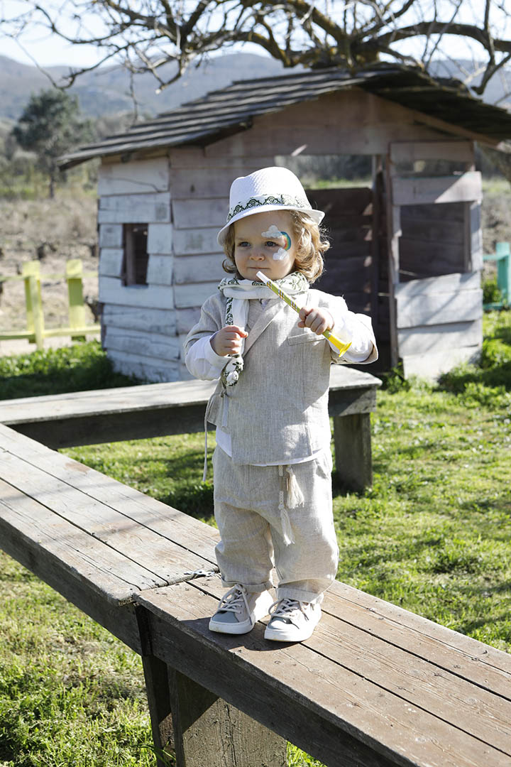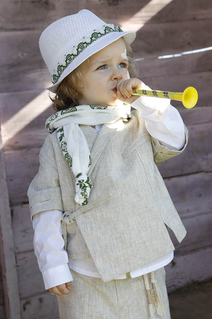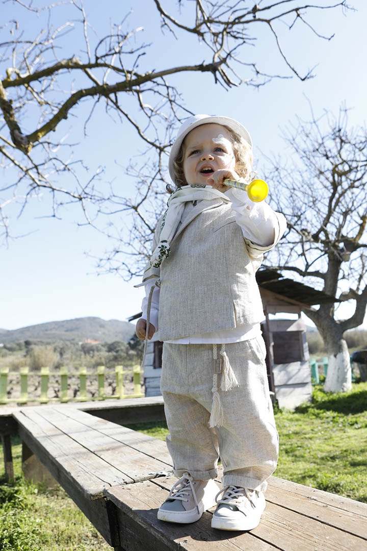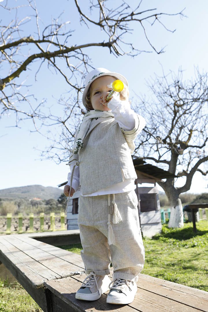 Ο Ivan είναι ένα μπεζ εκπληκτικό κοστούμι σε μία καινούρια εκδοχή για το πιο εντυπωσιακό σετ βάπτισης για το μωρό σας. Πουκαμίσα μπεζ κοντομάνικη με υπέροχα δεσίματα για ανάλαφρο στυλ σε 100% linetta. Παντελόνι ίδιο ύφασμα με την πουκαμίσα για απόλυτη αρμονία. Φουλάρι εκρού soft printed με μέντα σχέδιο και βαμβακερό κορδόνι για ζώνη. Καπέλο λευκό με τρέσσα απο το φουλάρι.