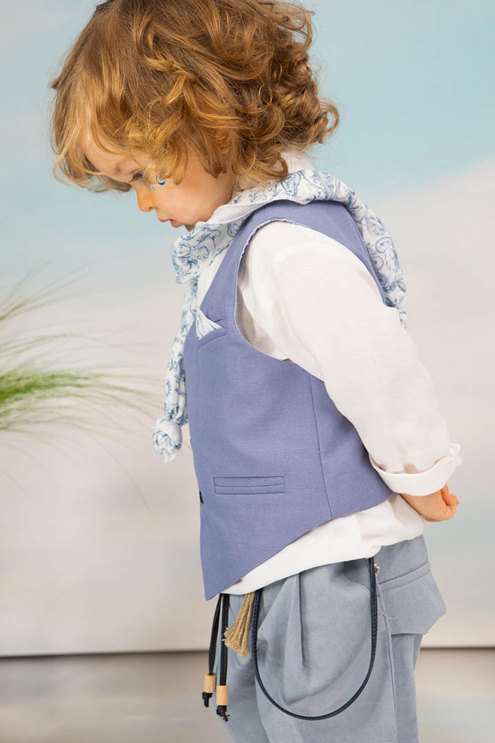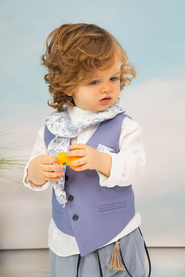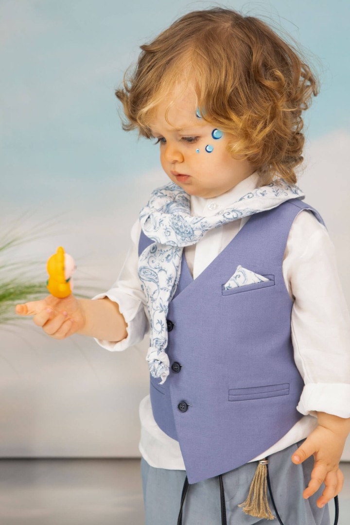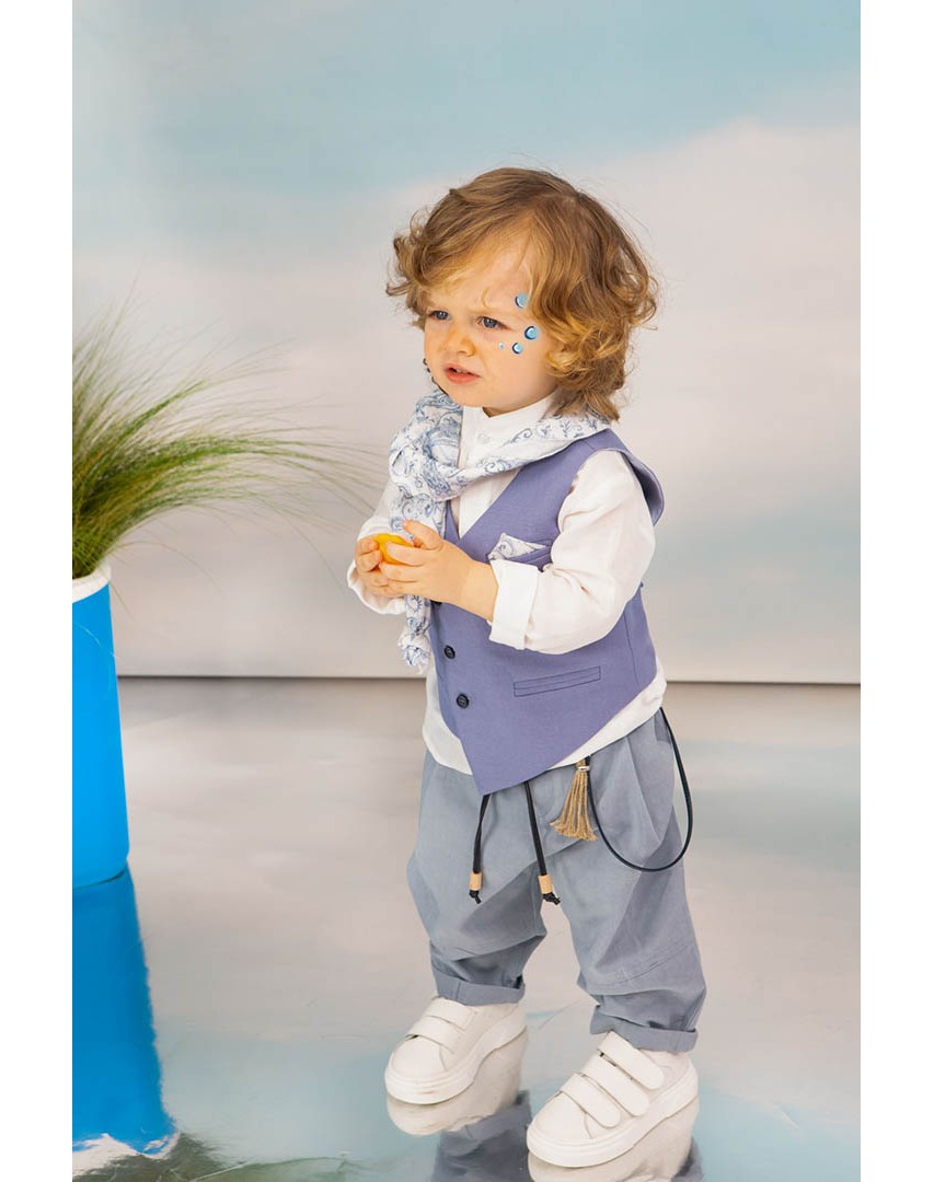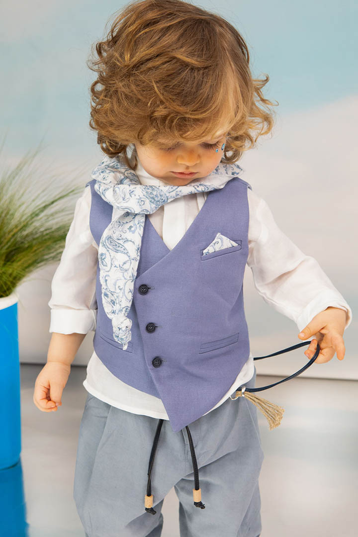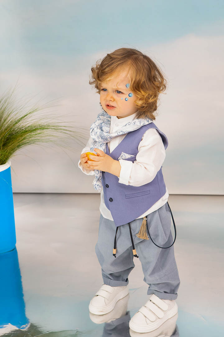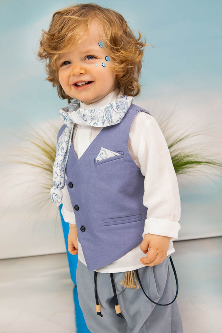 Ο Drosos είναι ένα ξεχωριστό σύνολο βάπτισης σε γκρι και provence blue αποχρώσεις. Γιλέκο diagonal καπαρντίνα Ιταλίας. Πουκαμίσα λευκή λινή 100% εξαιρετικής ποιότητας. Παντελόνι alternative καπαρντίνα Ιταλίας με μπλε δερμάτινη ζώνη και ιδιαίτερο αξεσουάρ. Φουλάρι και μαντήλι από soft touch printed cotton 100%. Καπέλο λευκό καβουράκι με τρέσσα από φουλάρι.