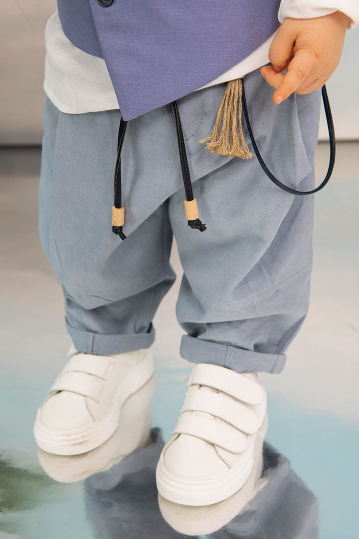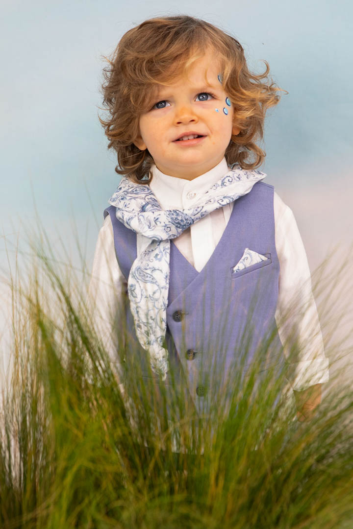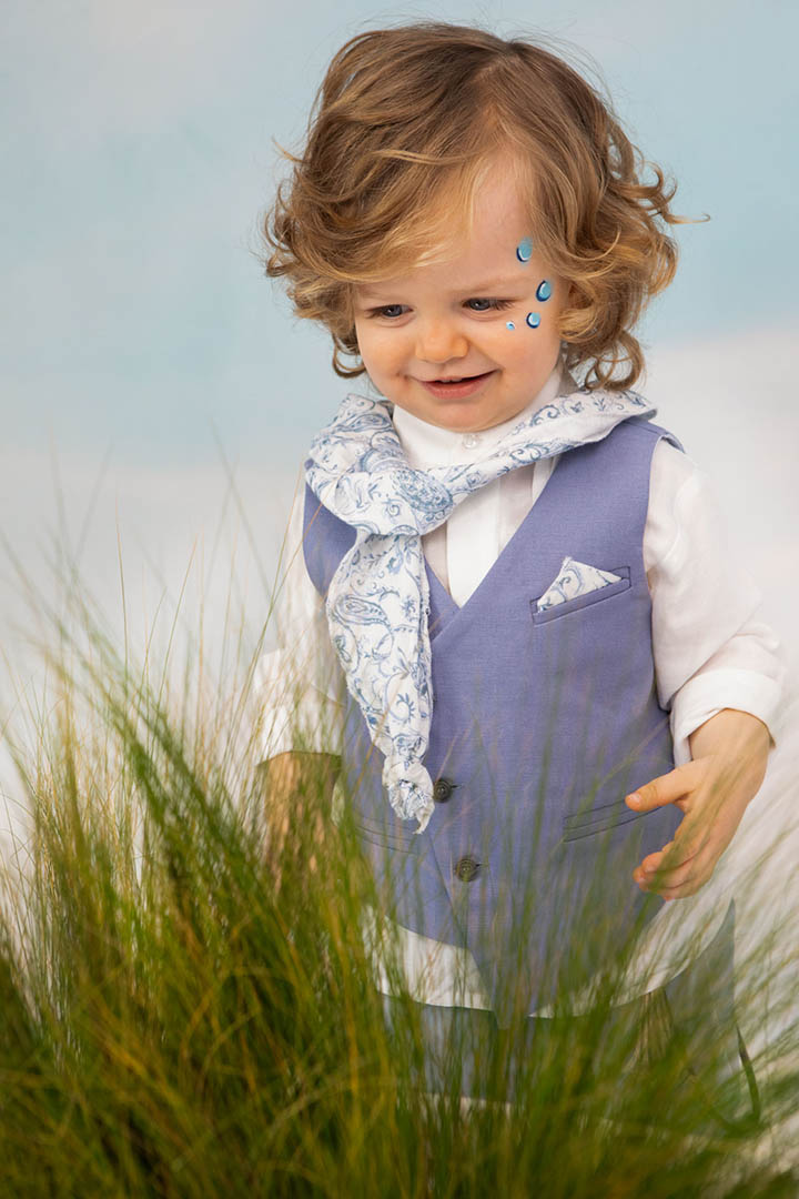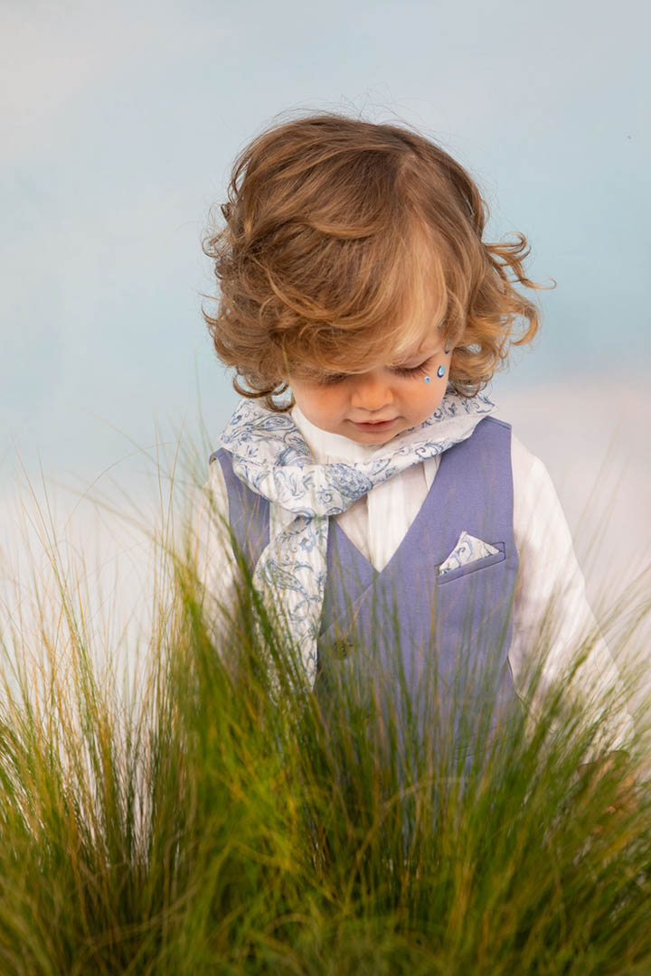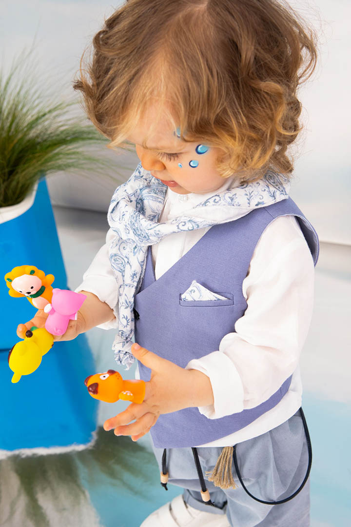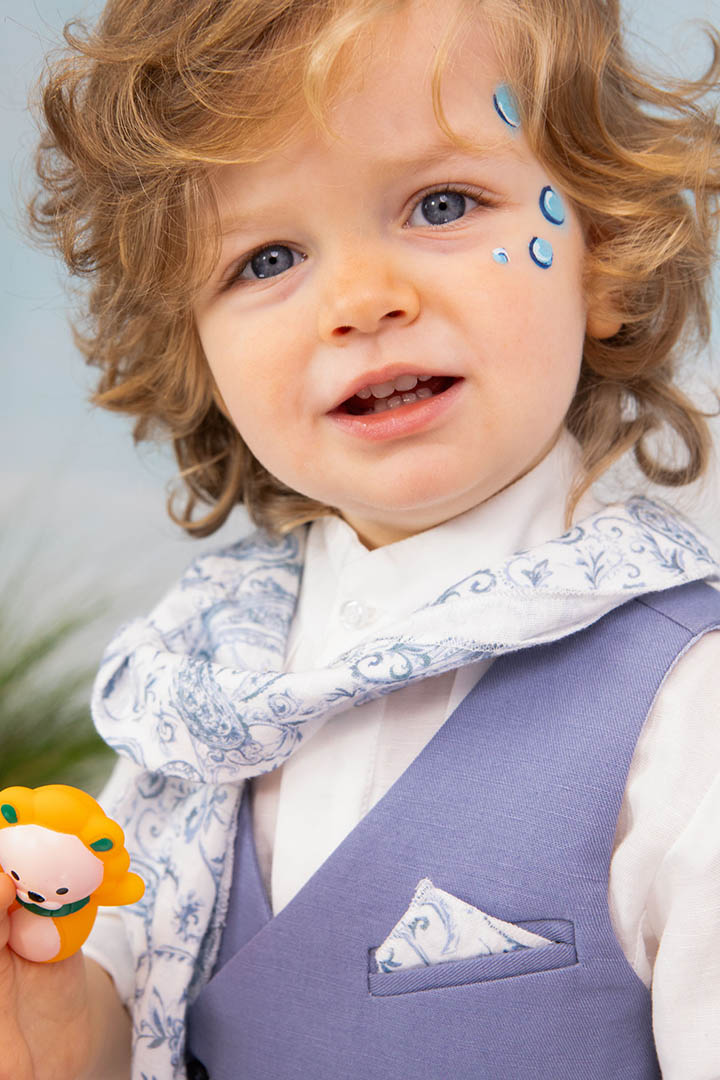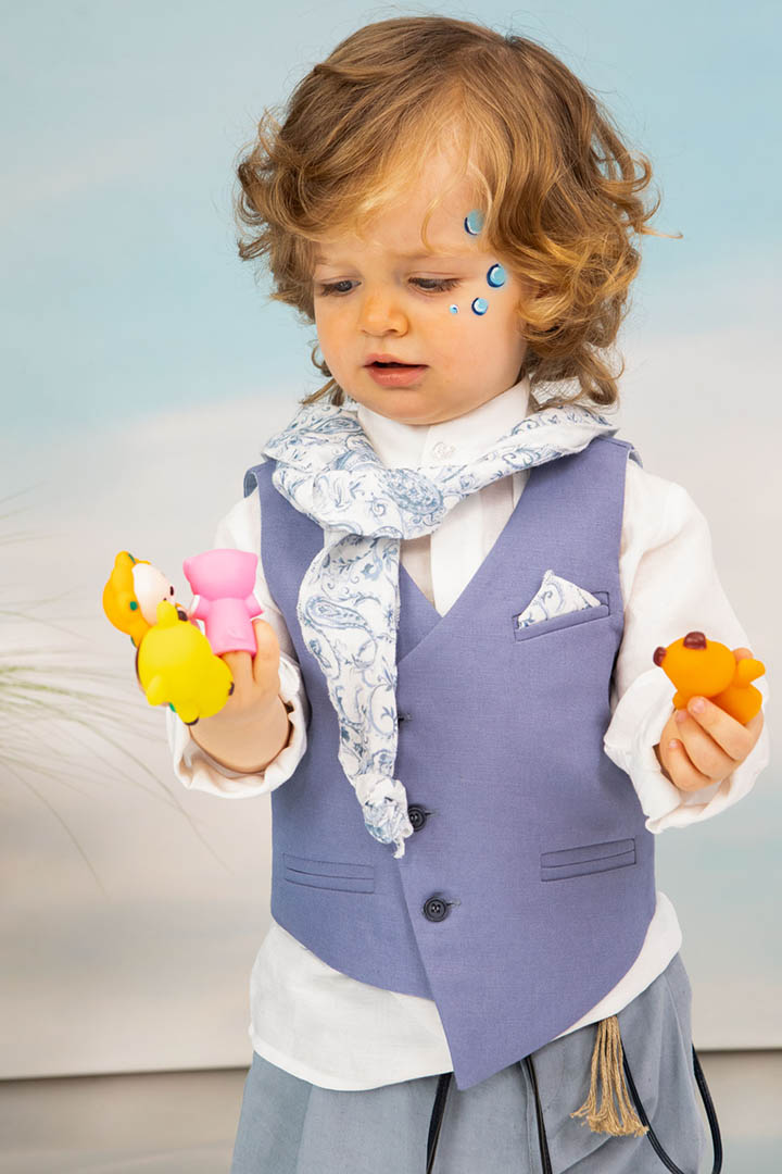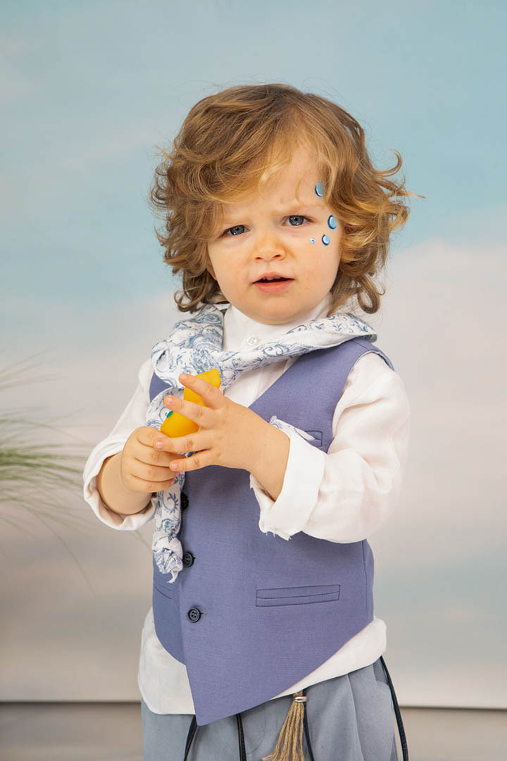 Ο Drosos είναι ένα ξεχωριστό σύνολο βάπτισης σε γκρι και provence blue αποχρώσεις. Γιλέκο diagonal καπαρντίνα Ιταλίας. Πουκαμίσα λευκή λινή 100% εξαιρετικής ποιότητας. Παντελόνι alternative καπαρντίνα Ιταλίας με μπλε δερμάτινη ζώνη και ιδιαίτερο αξεσουάρ. Φουλάρι και μαντήλι από soft touch printed cotton 100%. Καπέλο λευκό καβουράκι με τρέσσα από φουλάρι.