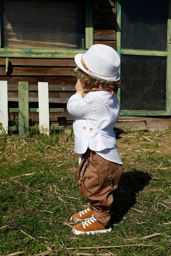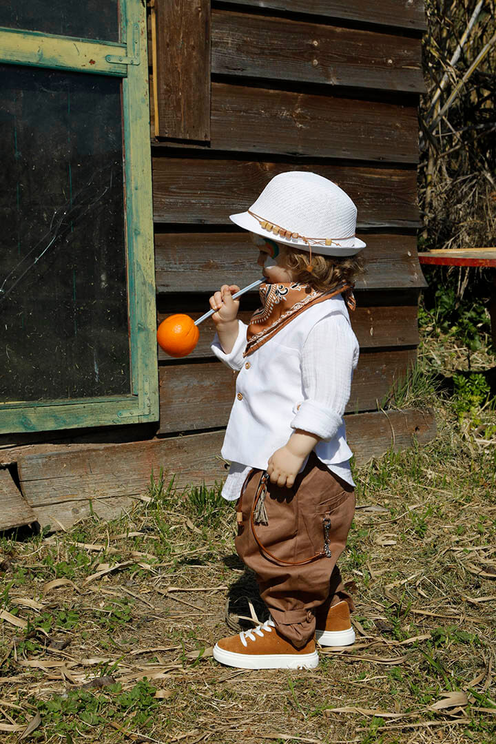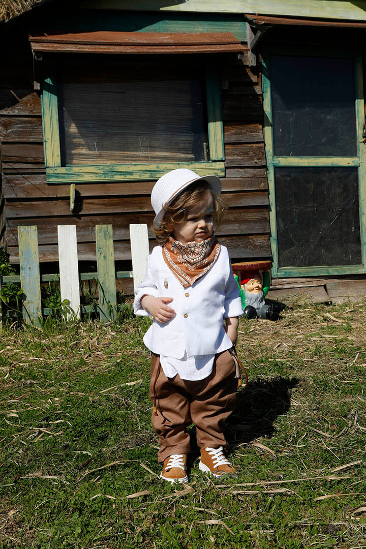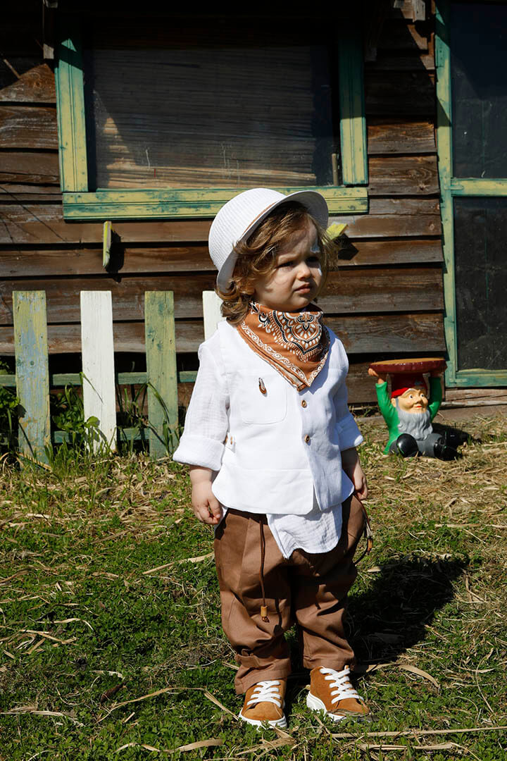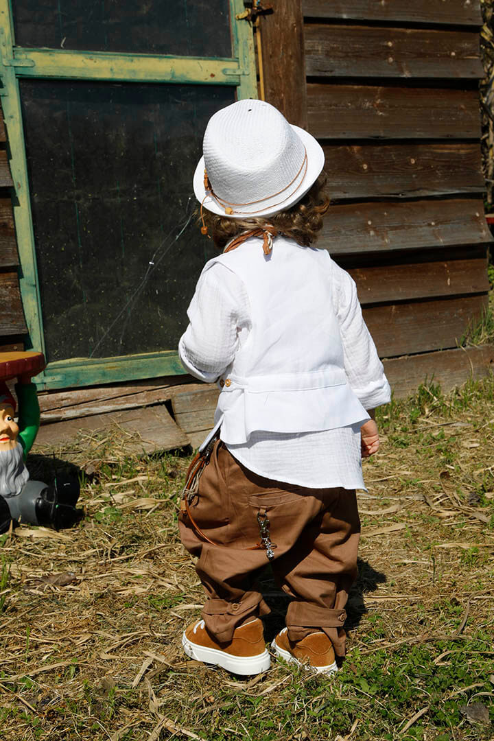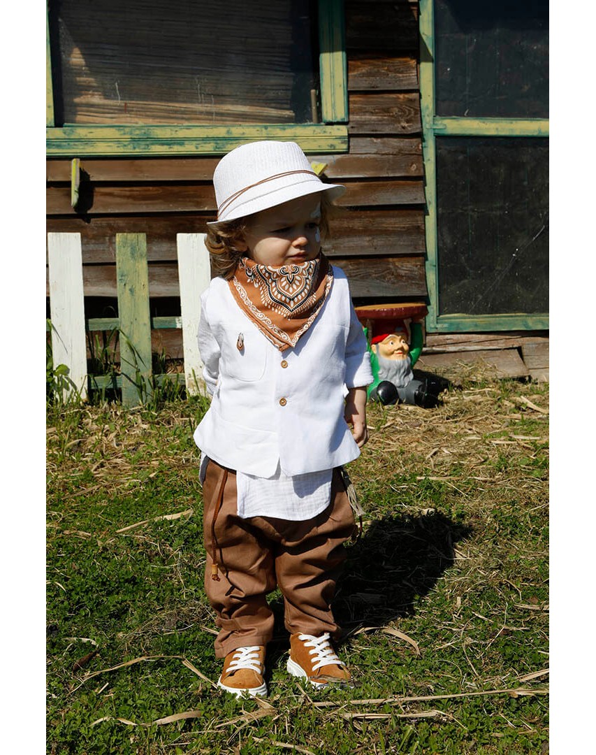 O Pantelis είναι ένα λευκό με ταμπά κοστούμι βάπτισης για ιδιαίτερη εμφάνιση. Γιλέκο λευκό 100% lino με δερμάτινο αξεσουάρ. Πουκάμισο λευκό σε ύφανση γκοφρέ και 100% cotton. Παντελόνι ταμπά από diagonal καπαρντίνα με δερμάτινη ζώνη και δερμάτινο κορδόνι με ασημένια μοτίφ. Φουλάρι: Σατέν φουλάρι με printed σχέδιο σε ταμπά χρώμα. Καπέλο λευκό με κορδόνι και χάντρες.