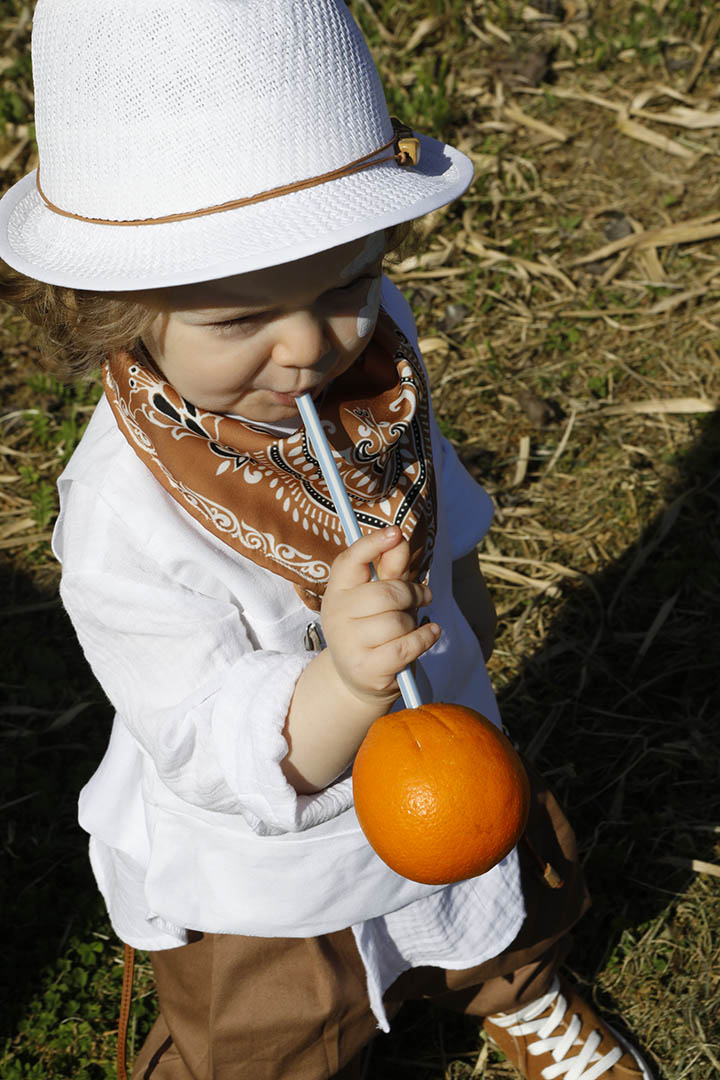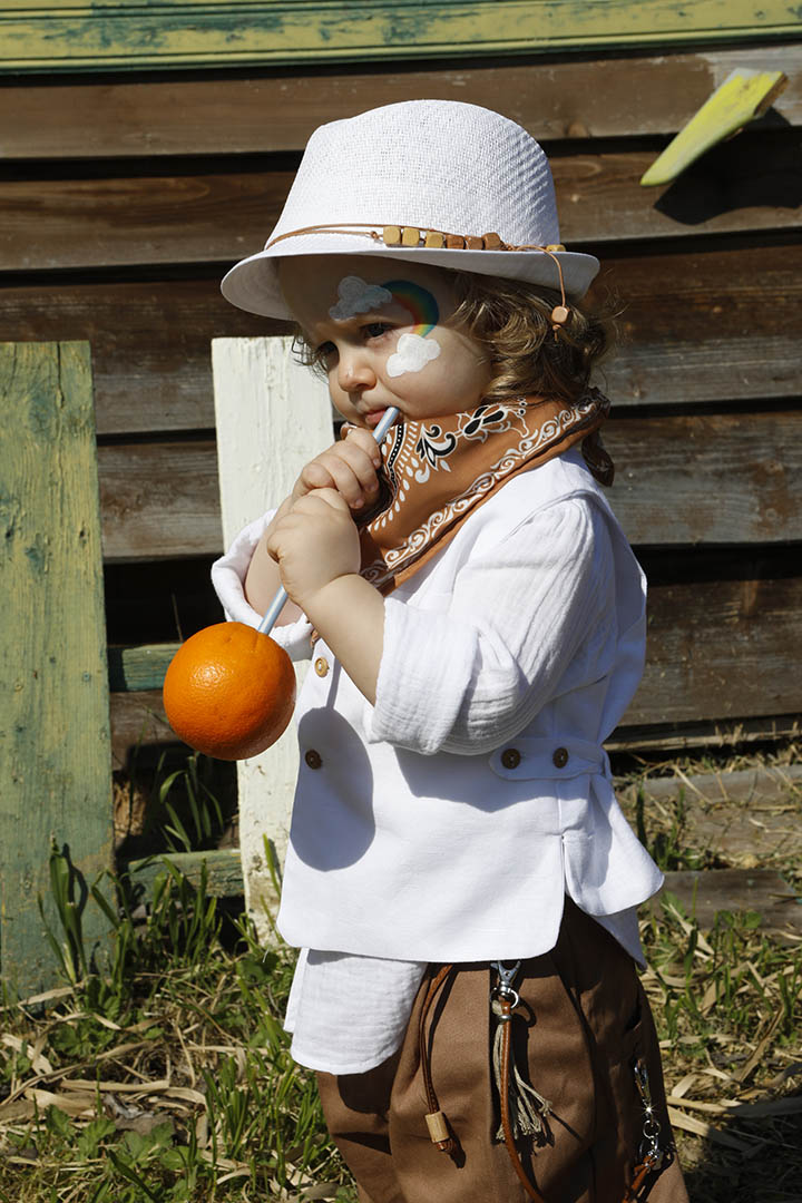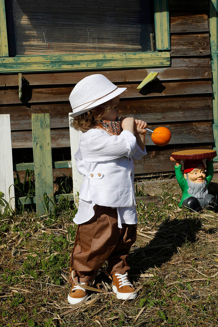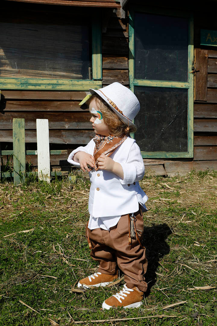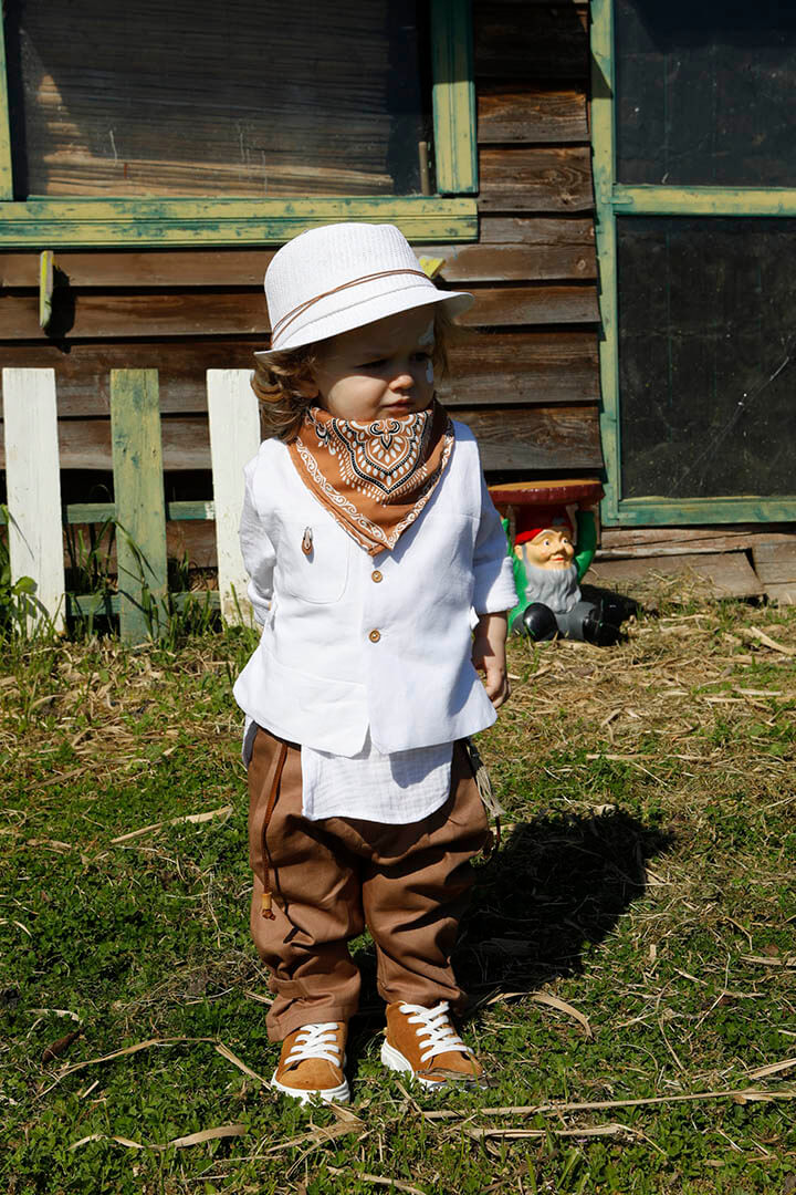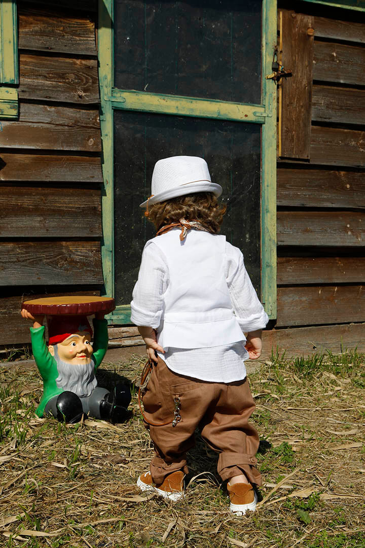 O Pantelis είναι ένα λευκό με ταμπά κοστούμι βάπτισης για ιδιαίτερη εμφάνιση. Γιλέκο λευκό 100% lino με δερμάτινο αξεσουάρ. Πουκάμισο λευκό σε ύφανση γκοφρέ και 100% cotton. Παντελόνι ταμπά από diagonal καπαρντίνα με δερμάτινη ζώνη και δερμάτινο κορδόνι με ασημένια μοτίφ. Φουλάρι: Σατέν φουλάρι με printed σχέδιο σε ταμπά χρώμα. Καπέλο λευκό με κορδόνι και χάντρες.