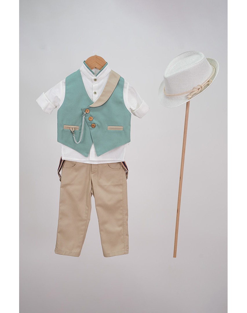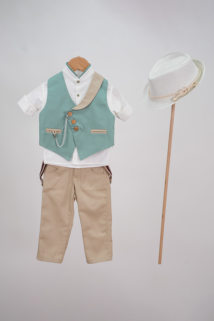Ιδιαίτερο και κομψό κοστούμι από Nikos-Takis. Αποτελείται από μπεζ παντελόνι καπαρντινέ με τιράντες, λευκό πουκάμισο με γιακά mao, και λεπτομέρεια βεραμάν. Το κοστούμι ολοκληρώνει το μοντέρνο γιλέκο σε βεραμάν απόχρωση με μπεζ λεπτομέρειες  και ένα αλυσιδάκι.