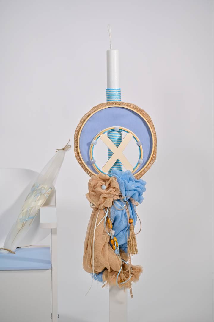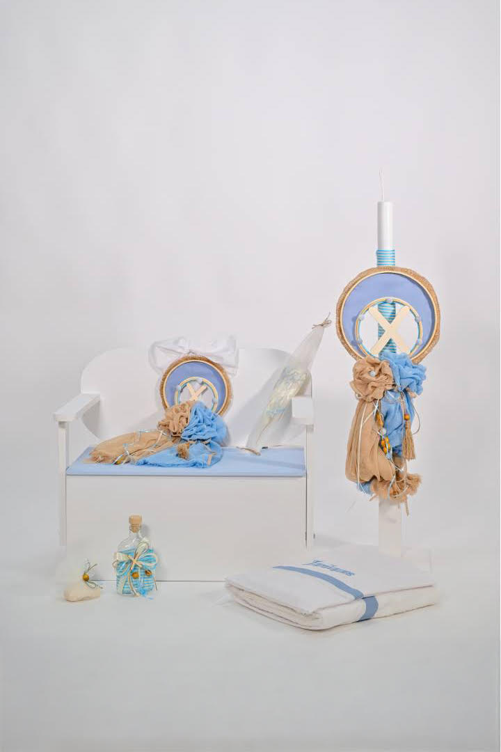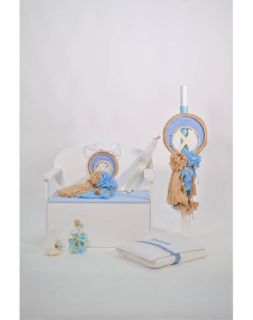 Αποτελείται από θρανίο λευκό με γαλάζιες λεπτομέρειες, λαμπάδα με υφάσματα γάζας σε αποχρώσεις καφέ-γαλάζιο με μονόγραμμα, σετ λαδιού (κεράκια, μπουκαλάκι, σαπουνάκι) σε ίδιες αποχρώσεις και λαδόπανα με κεντημένο όνομα.