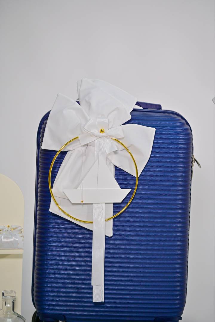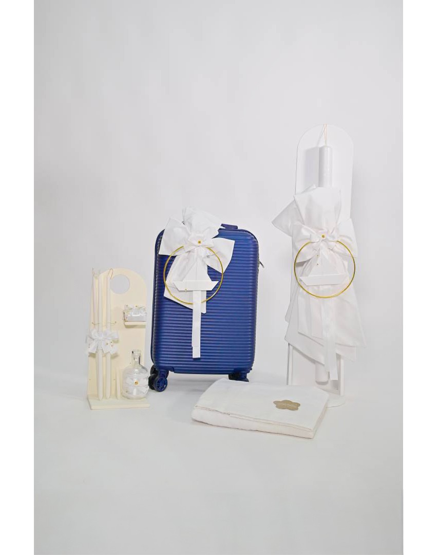 Πακέτο βάπτισης με θέμα το καραβάκι σε λευκό χρώμα με χρυσές λεπτομέρειες και μπλε βαλίτσα.