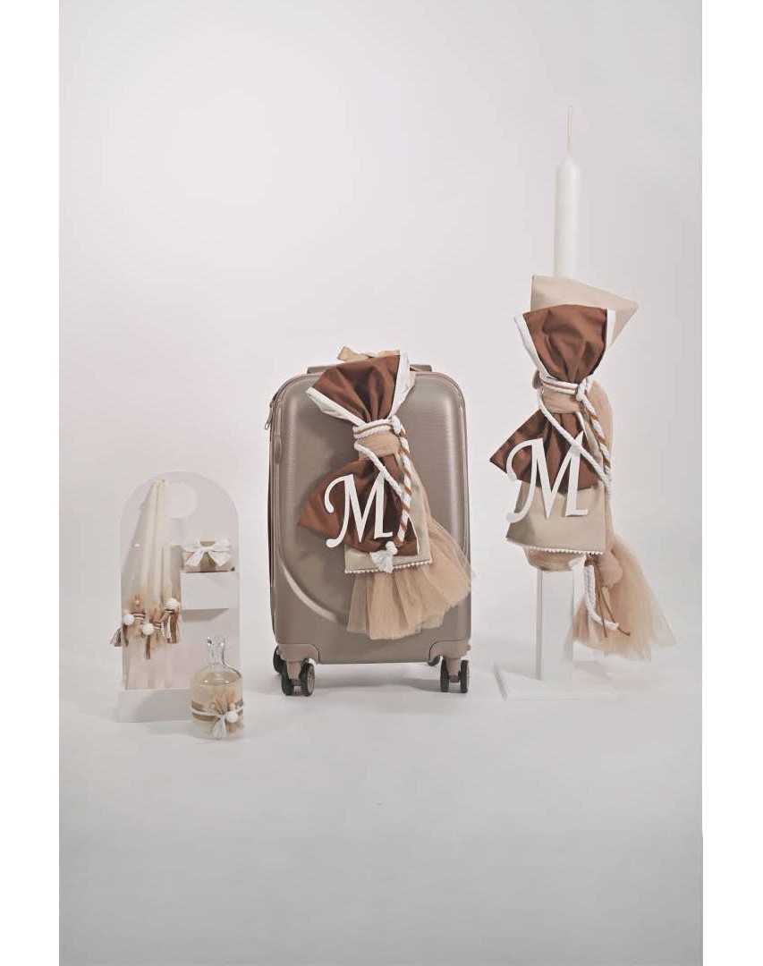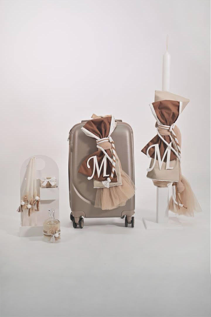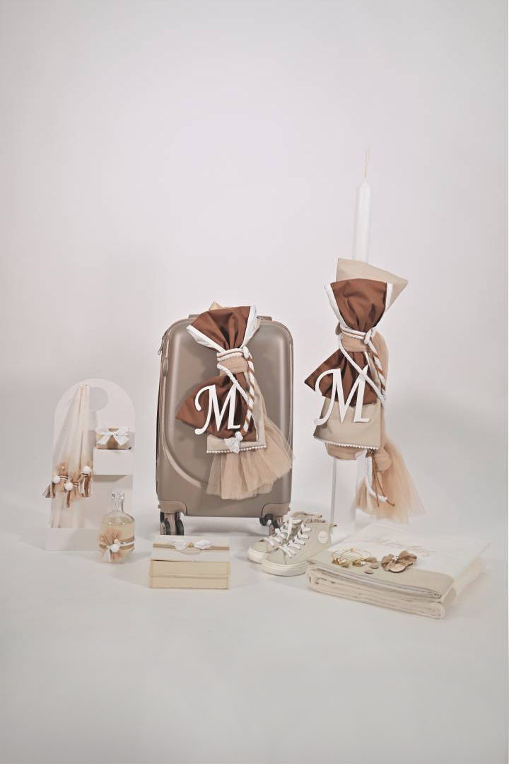 Πακέτο βάπτισης για αγόρι σε γήινους τόνους, μπεζ-καφέ κορδόνια  και μονόγραμμα. Σχεδιασμένο με προσοχή στη λεπτομέρεια για να είναι εκείνη η μέρα η πιο ξεχωριστή.