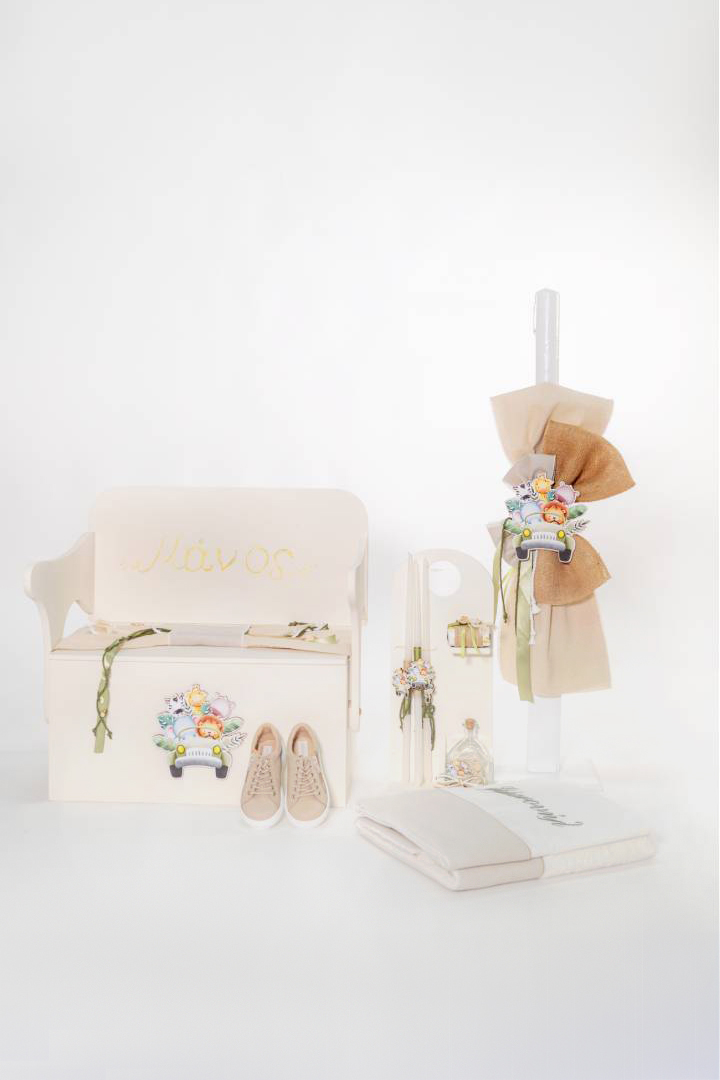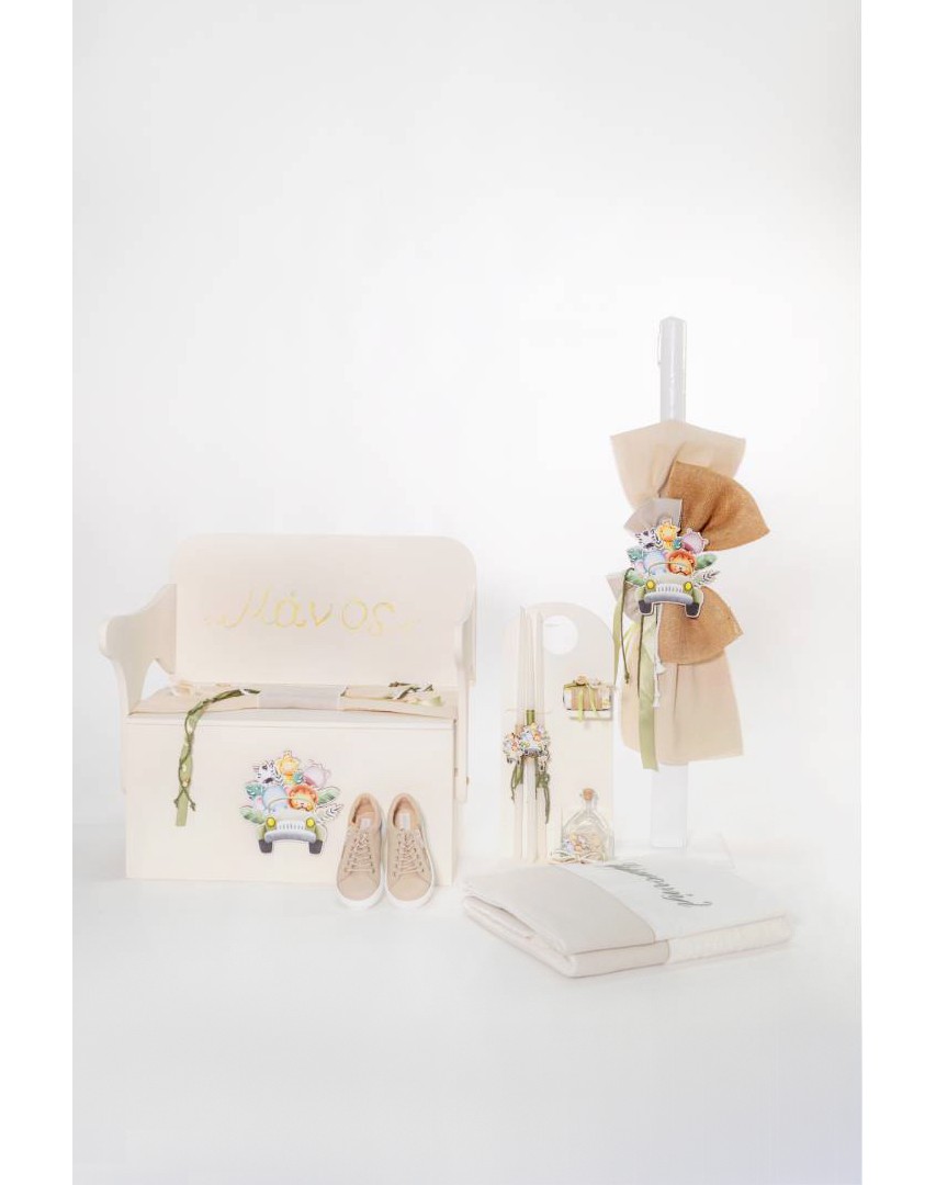 Πακέτο βάπτισης με ξύλινο παγκάκι που μετατρέπεται σε θρανίο. Ένα πακέτο με θέμα τα ζωάκια του δάσους και παιχνιδιάρικη διάθεση,  με δεσίματα σε γήινες αποχρώσεις και λεπτομέρειες λαδί.