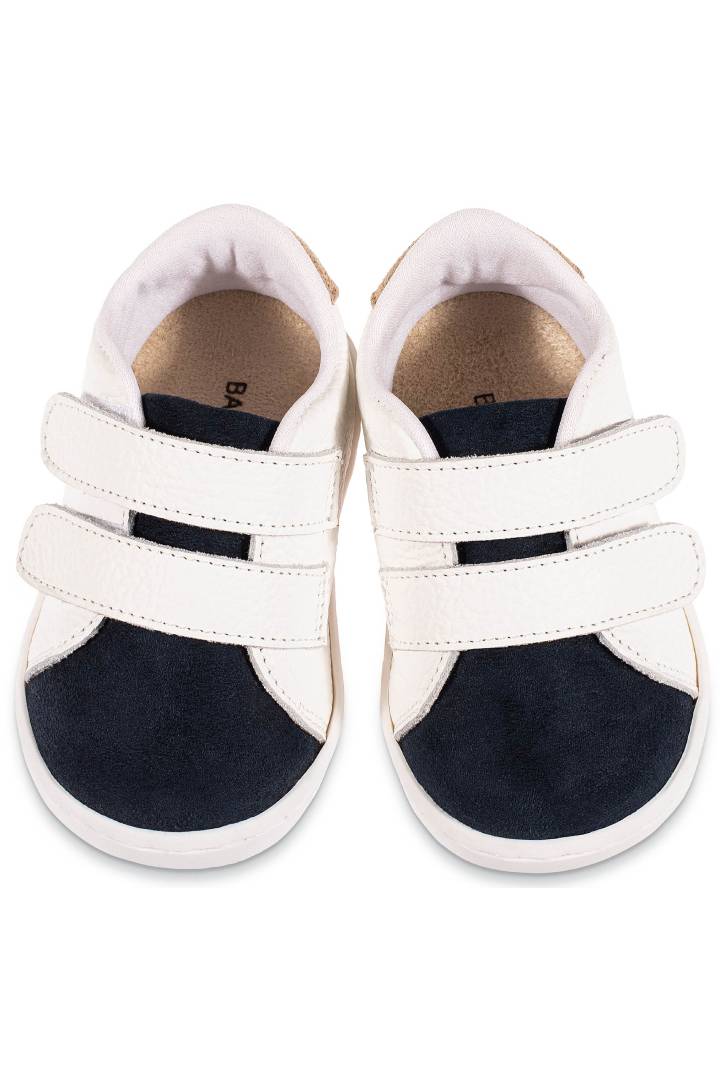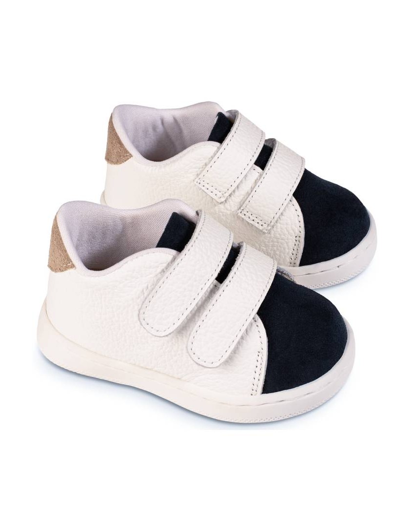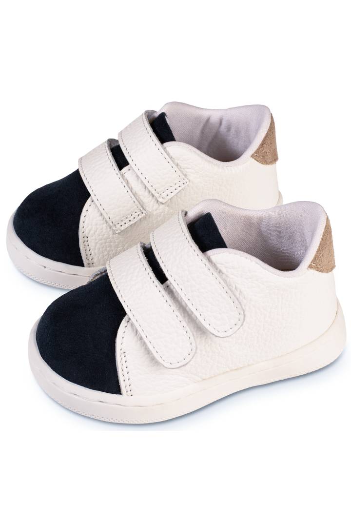Βαπτιστικό δερμάτινο, τρίχρωμο sneaker Babywalker με διπλή μπαρέτα σε λευκό-μπλε-μπεζ.