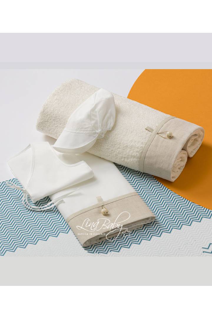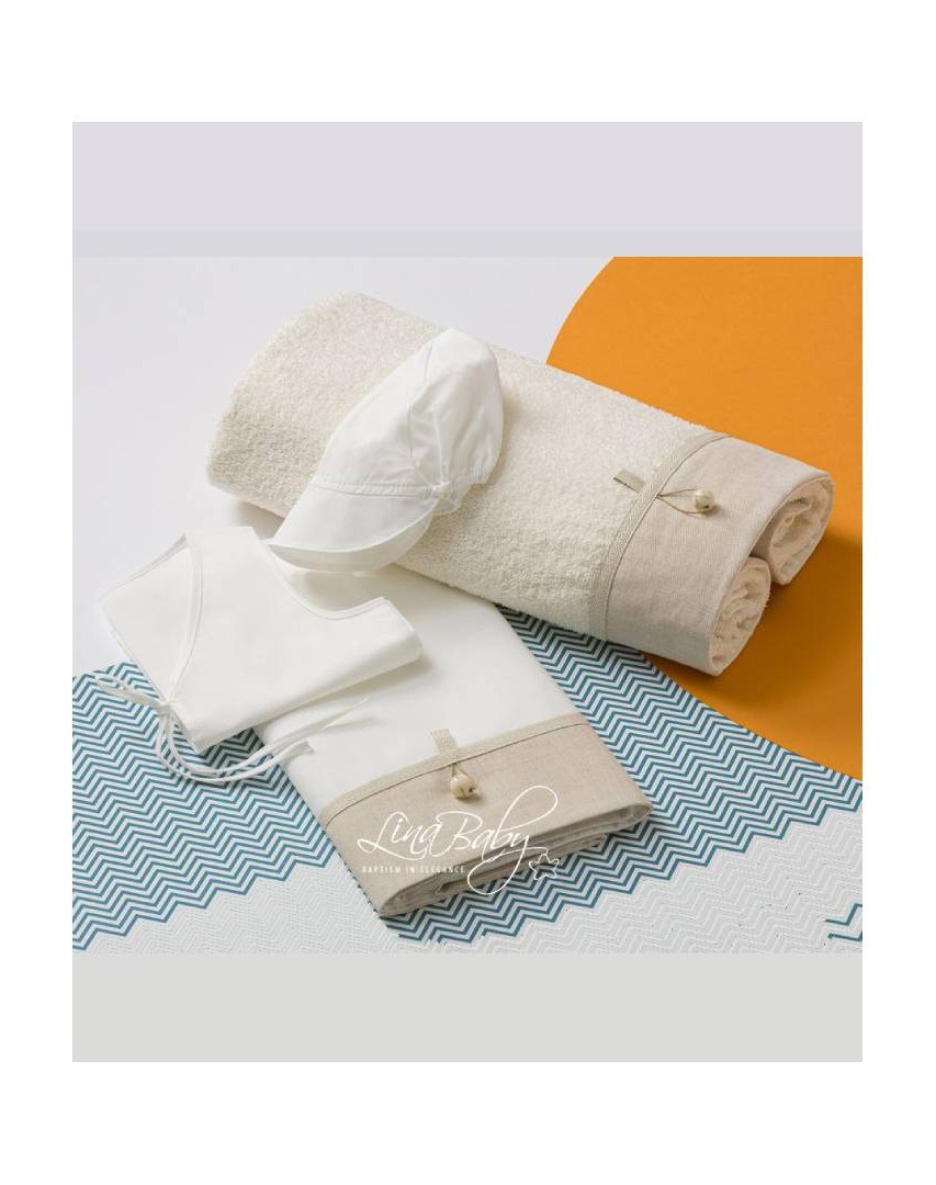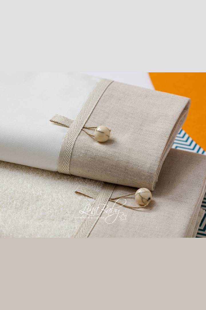 Βαμβακερό σετ λαδόπανου σε Ιβουάρ χρώμα με φάσα από 100% λινό ύφασμα στο χρώμα της άμμου. Γκρο βαμβακερή τρέσα και χάντρα διακοσμητική κοσμούν την μέση του λαδοπάνου.
