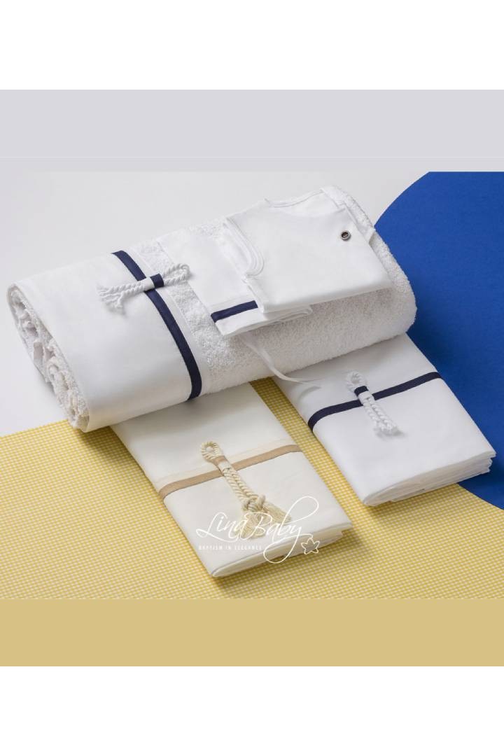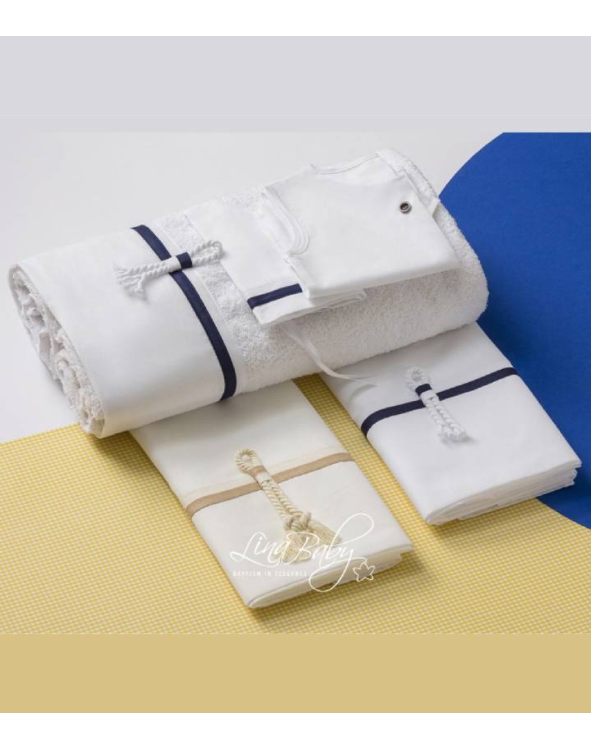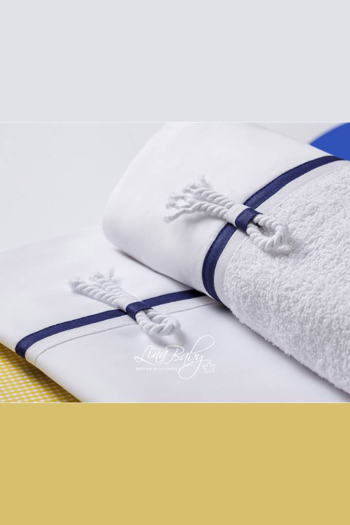 Με διπλές διακοσμητικές τρέσες στις αποχρώσεις του Λευκού- Μπλέ και Εκρού-Μπεζ αντίστοιχα και διακοσμητικό χοντρό κορδόνι όπου με το Ναυτικό δέσιμο ολοκληρώνει το Ναυτικό του χαρακτήρα.