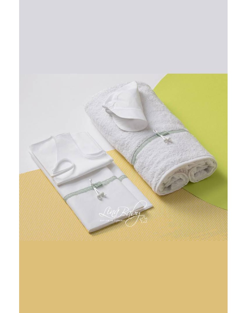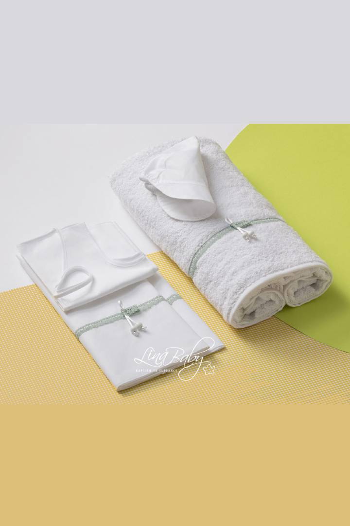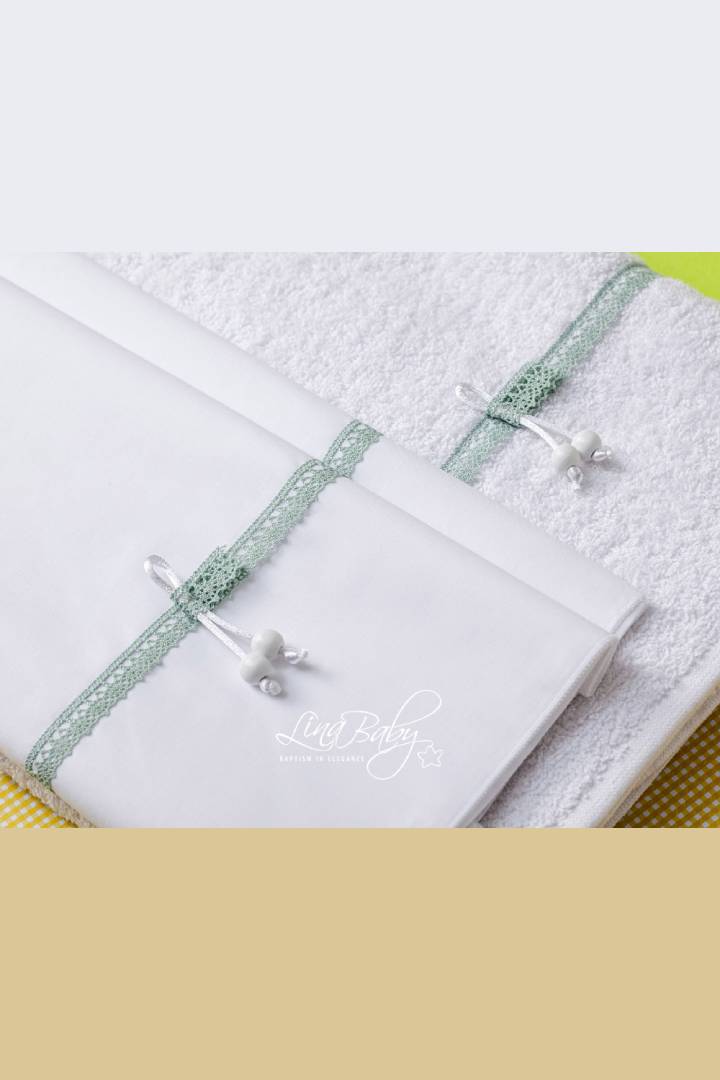 Βαμβακερό σετ λαδόπανου σε λευκό χρώμα με διακοσμητική τρέσα τύπου βελονάκι της γιαγιάς σε απόχρωση της μέντας και διακοσμητικές λευκές ξύλινες χάντρες.