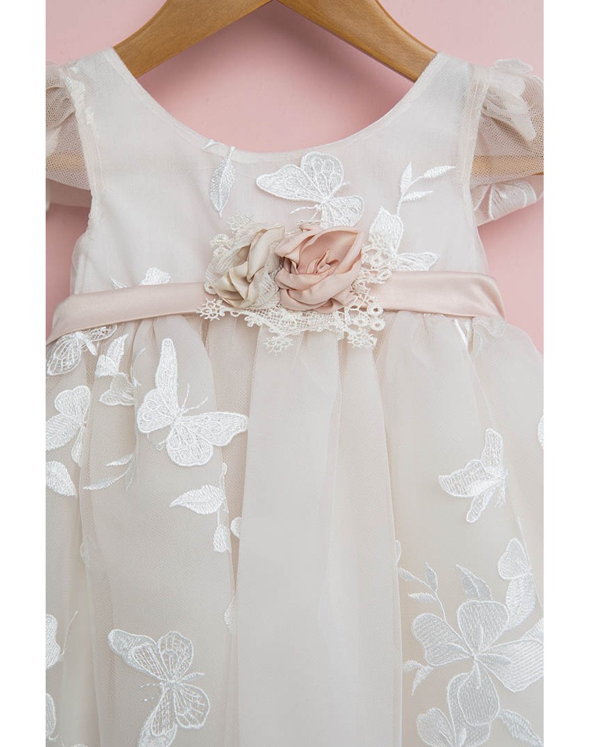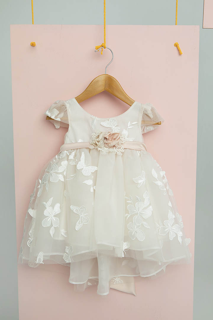 Ασύμμετρο nude εκρού φόρεμα με 3d κεντημένες πεταλούδες πάνω σε τούλι να στολίζουν το φόρεμα. Υπέροχος στολισμός τα hand made λουλούδια. Αξεσουάρ nude κορδέλα με χειροποίητα λουλούδια. Σύνθεση υφασμάτων. Τούλι 3d Γαλλίας. Nude τούλι Γαλλίας. Οργάντζα Γαλλίας. 100% cotton. Ελληνικής ραφής.