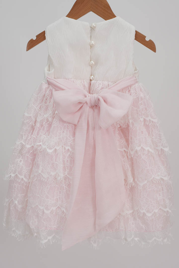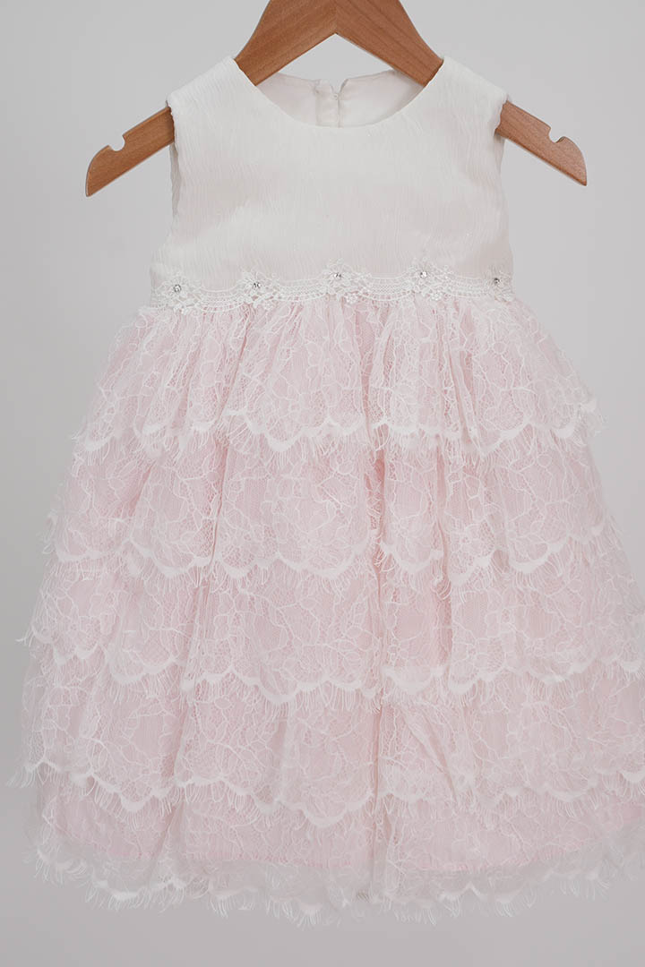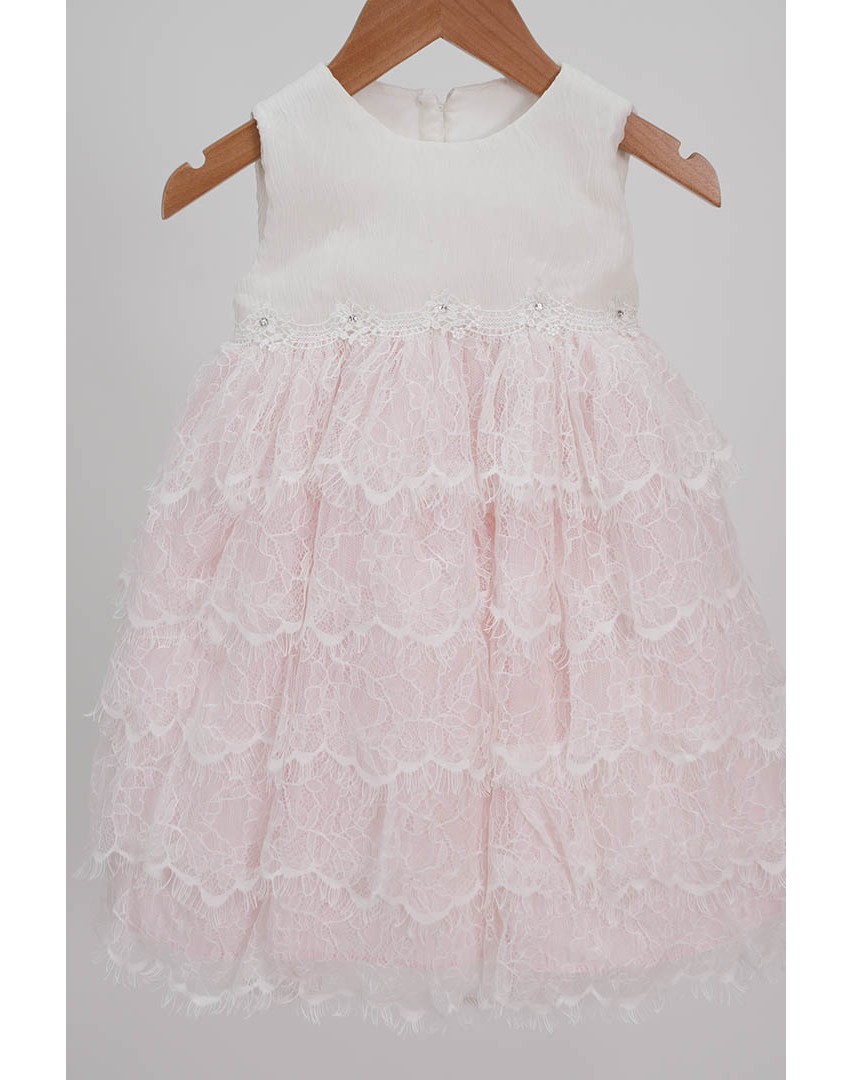 Η πλούσια δαντελένια φούστα σε απαλό ροζ χαρίζει αέρινη κίνηση  ενώ το λιτό ιβουάρ κορσάζ δημιουργεί μια διακριτική ισορροπία κομψότητας και απλότητας.