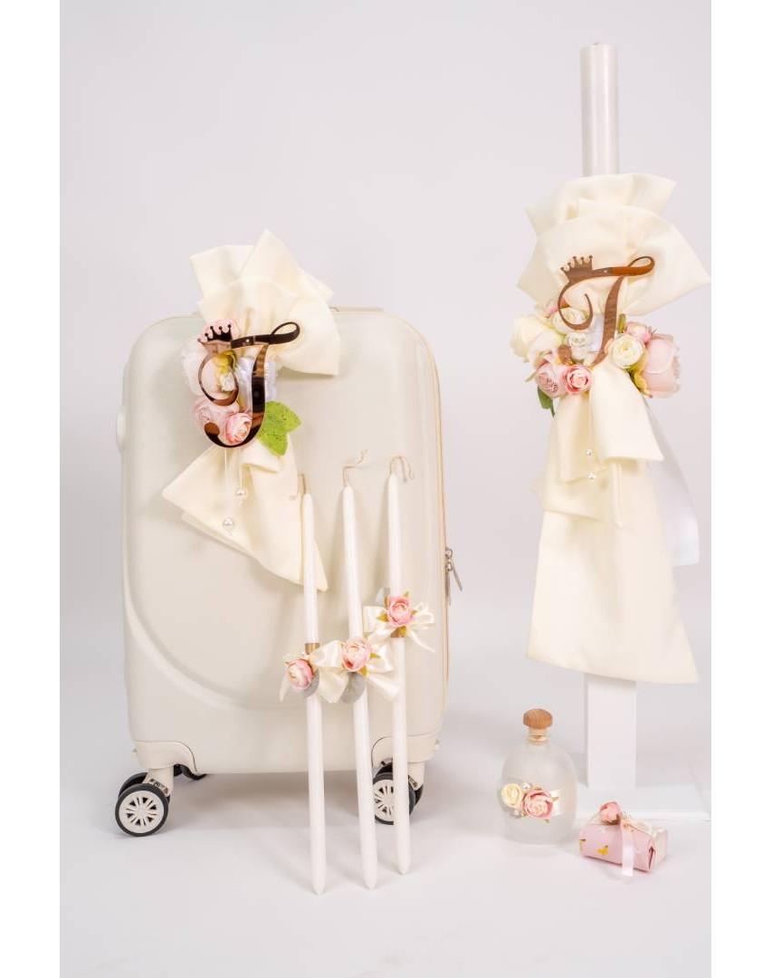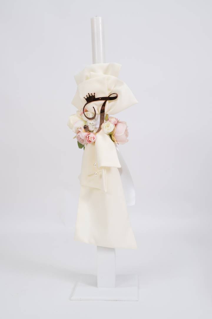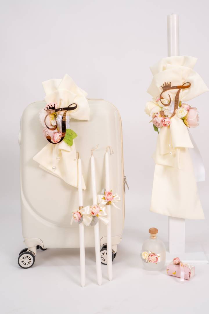 Εντυπωσιακό πακέτο βάπτισης για κορίτσι σε εκρού αποχρώσεις και λουλούδια σε ροζ και εκρού τόνους και μονόγραμμα πλεξιγκλάς ροζ-χρυσό.