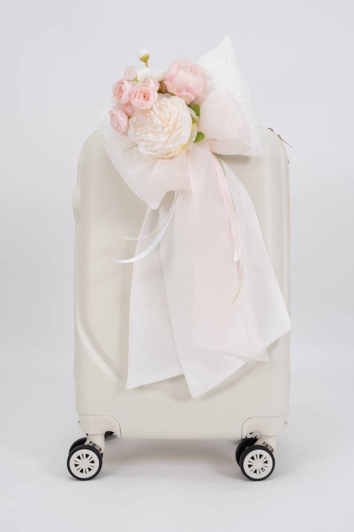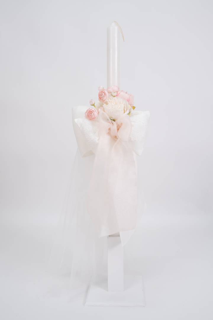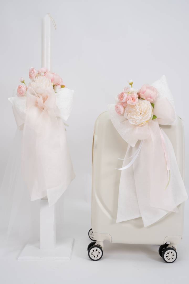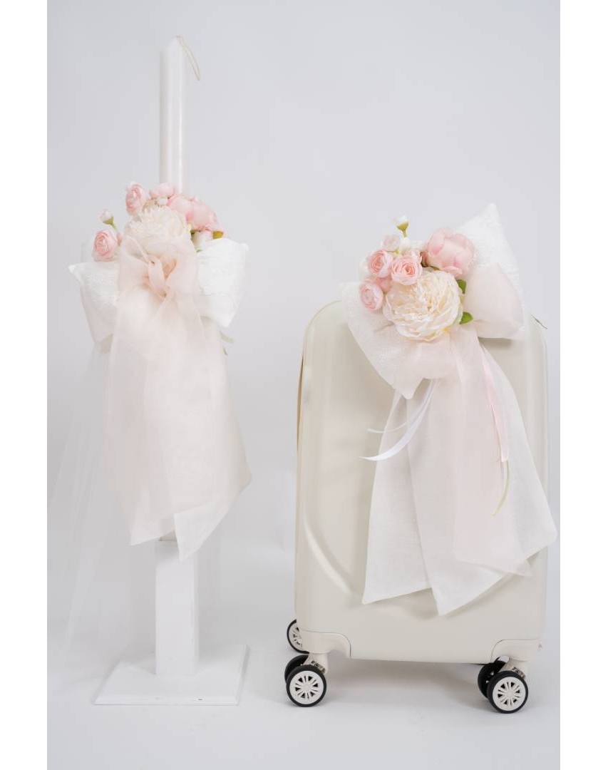 Πακέτο βάπτισης για κορίτσι με θέμα τα λουλούδια. Σχεδιασμένο με ρομαντική διάθεση, με φίνα υλικά σε τόνους λευκό και ροζ.