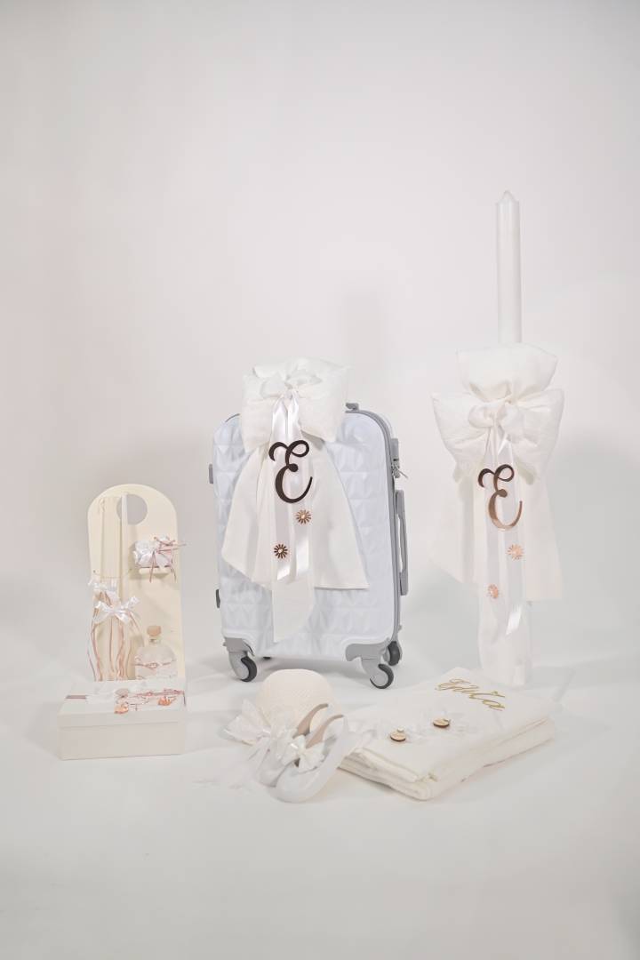 Πακέτο βάπτισης για κορίτσι, όλα λευκά με λεπτομέρειες ροζ-χρυσό. Σχεδιασμένο με φίνα υλικά, εντυπωσιακούς φιόγκους που προσδίδουν μια φινέτσα για την πιο ξεχωριστή αυτή στιγμή.