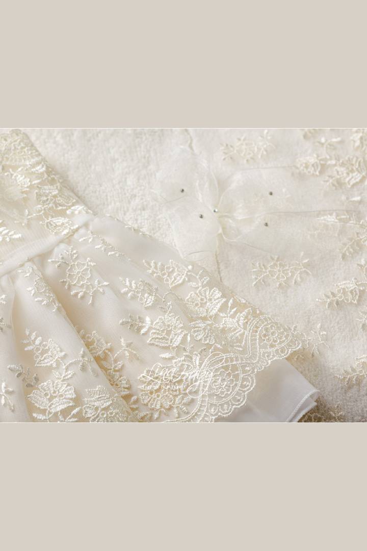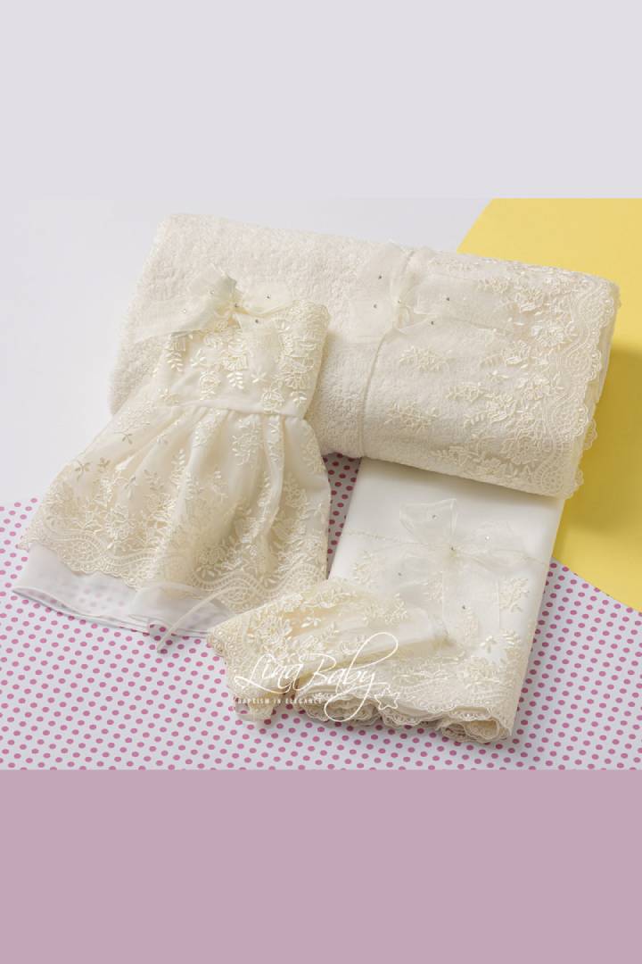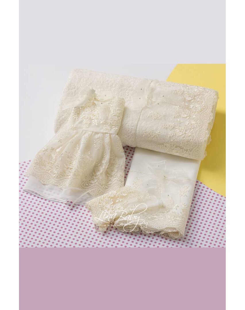 Βαμβακερό σετ λαδόπανου σε δύο χρώματα λευκό και ιβουάρ με εντυπωσιακή γαλλική δαντέλα και φιόγκο από οργαντίνα με στρας τύπου Swarovski.