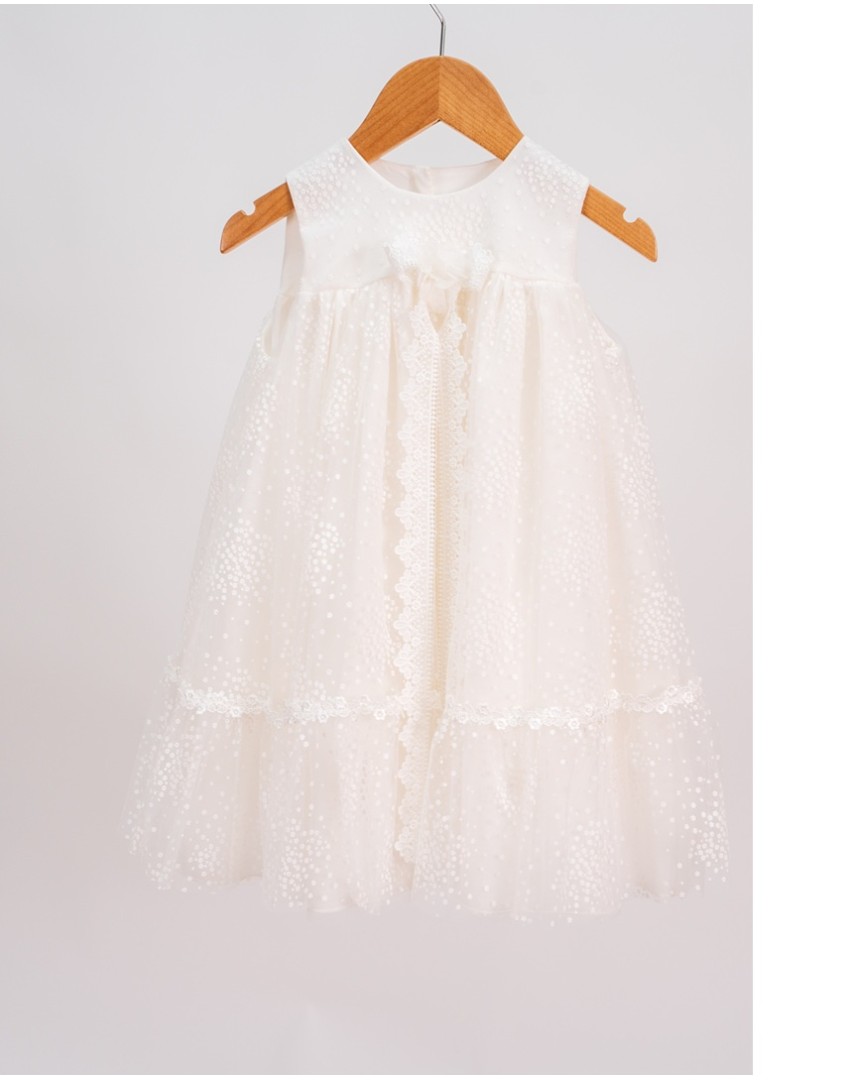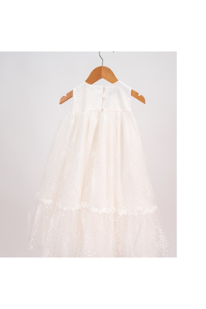 Εντυπωσιακό βαπτιστικό φόρεμα σε ρομαντικό ύφος, φτιαγμένο από μαλακό τούλι που χαρίζει αέρινη κίνηση και κομψότητα.