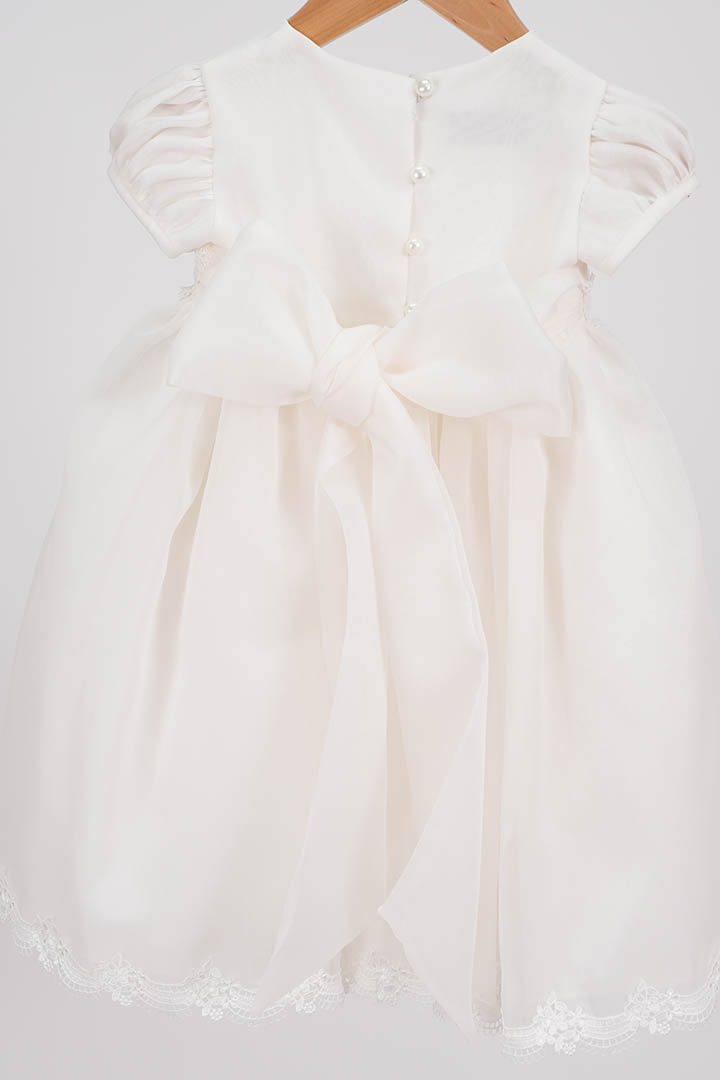 Ρομαντικό βαπτιστικό φόρεμα σε κομψή απόχρωση ιβουάρ, φτιαγμένο από αέρινη οργαντίνα που χαρίζει απαλή υφή και φίνα κίνηση.