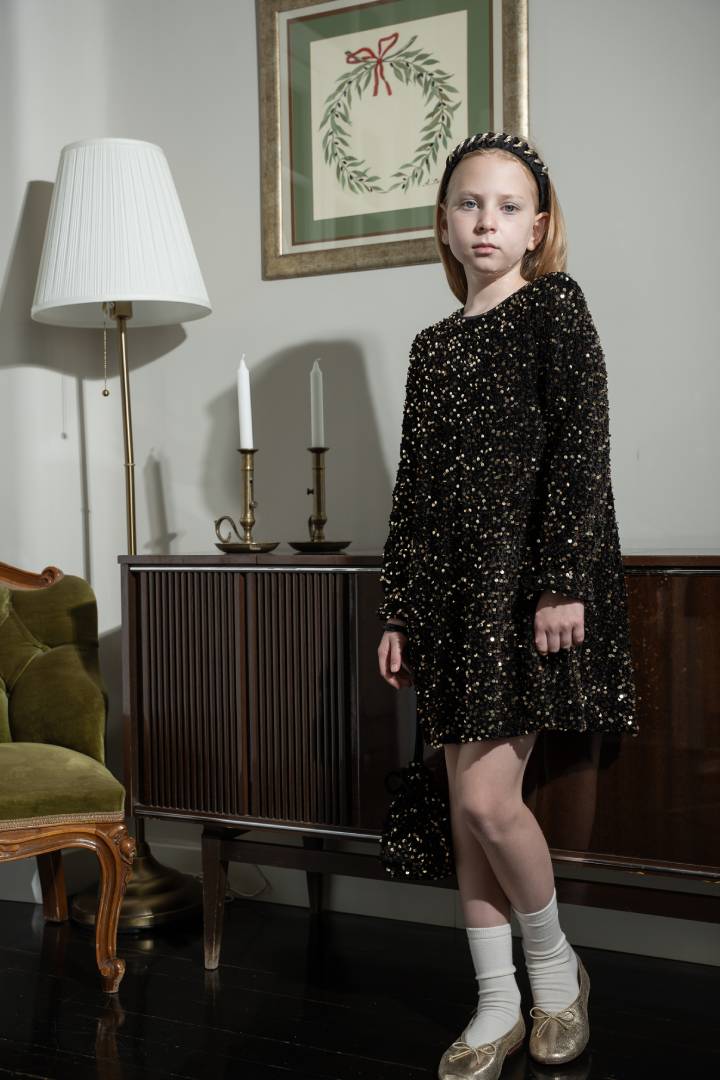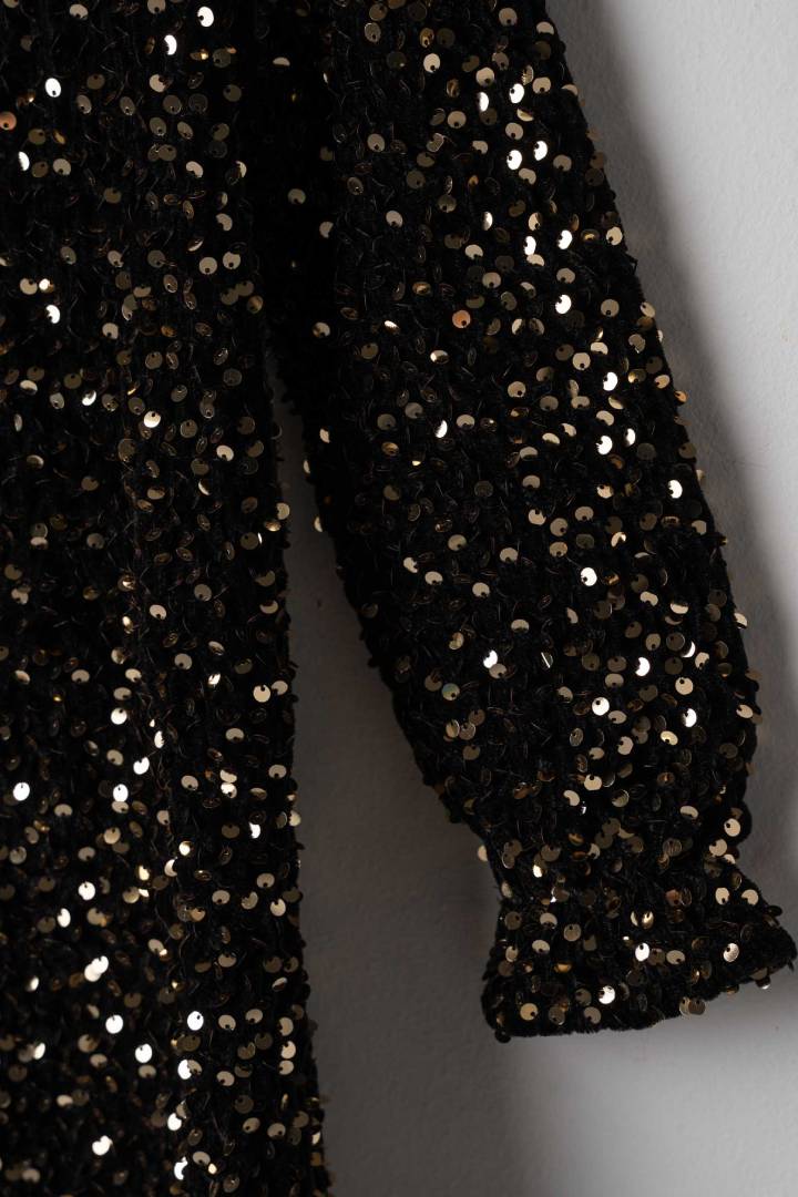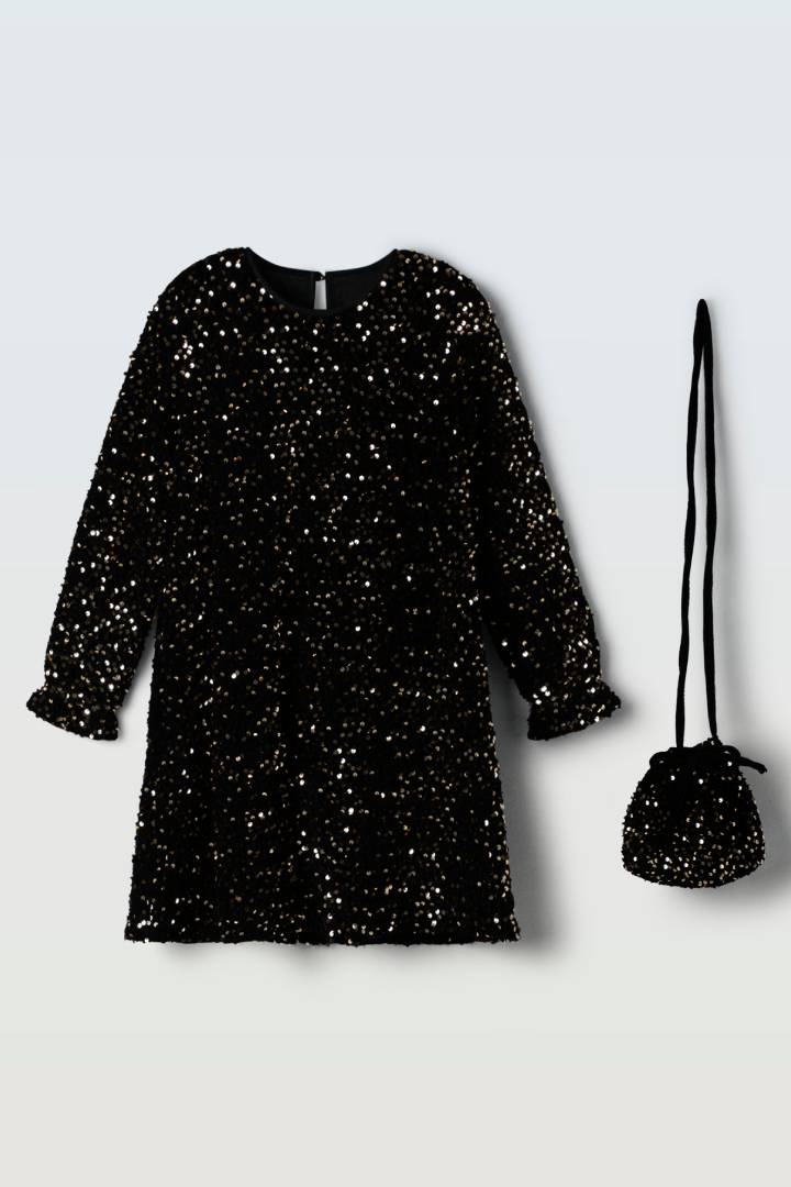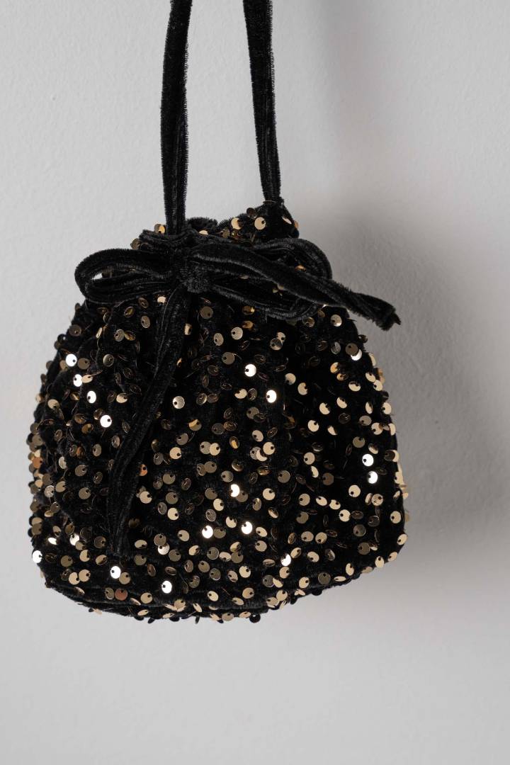Μαύρο βελούδινο φόρεμα με παγιέτες σε χρυσό χρώμα Εβίτα. Αξεσουάρ τσαντάκι-πουγκί. Ιδανικό για μια εντυπωσιακή εμφάνιση με λάμψη και στύλ.