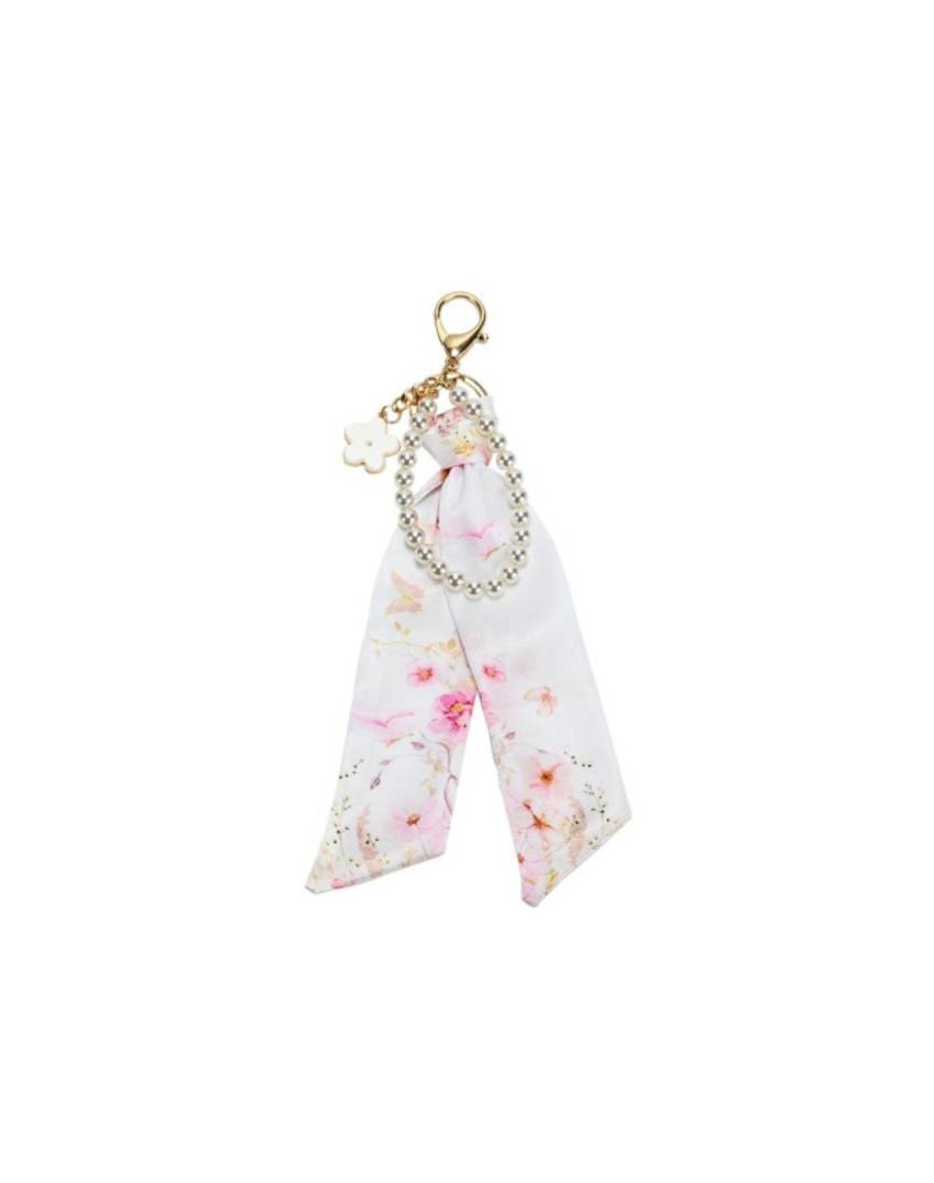 Ένα ιδιαίτερο charm με μαντηλάκι σε ρομαντικό ροζ μοτίβο, διακοσμημένο με πέρλες και μεταλλικό λουλουδάκι, σχεδιασμένο για να δίνει ξεχωριστό χαρακτήρα σε κάθε εμφάνιση.