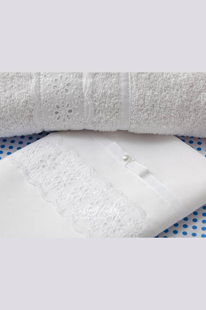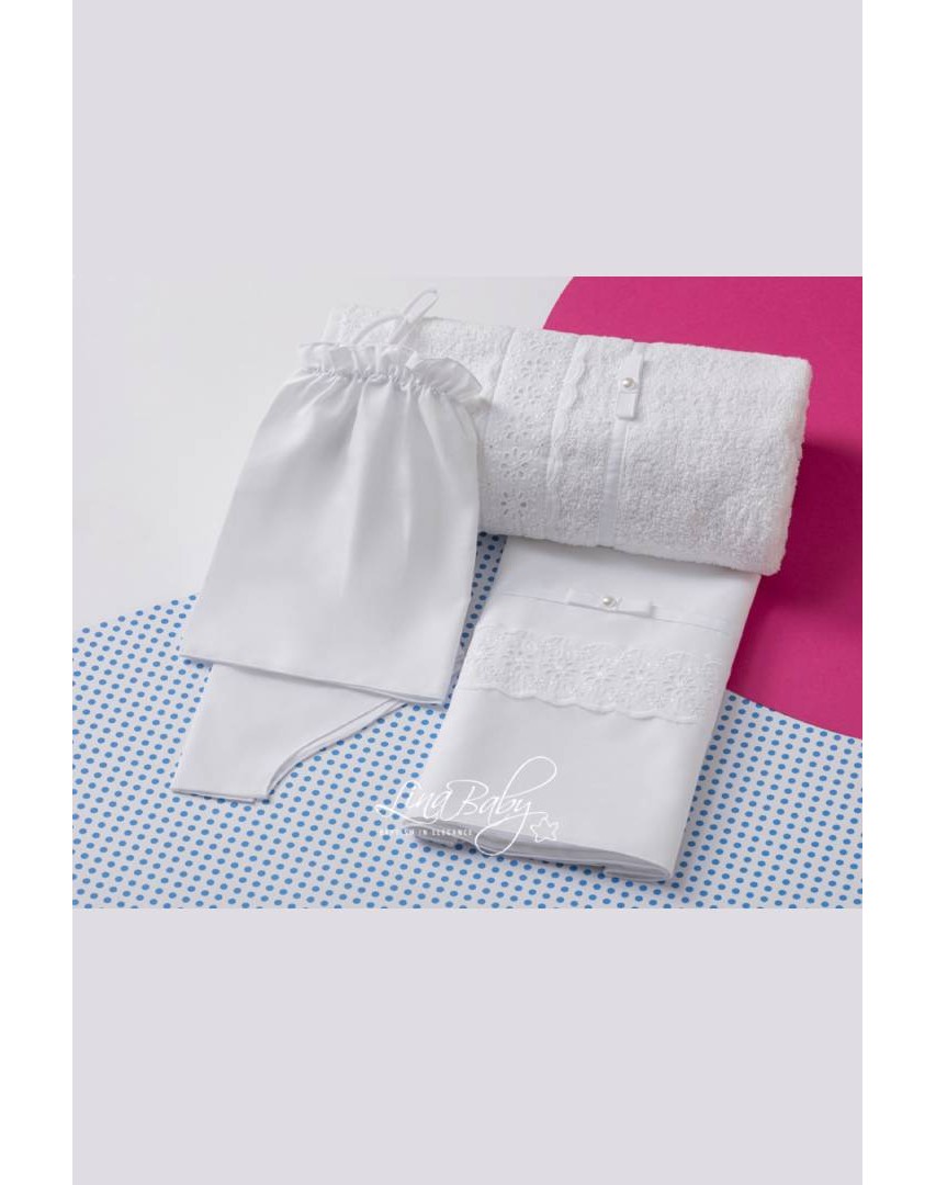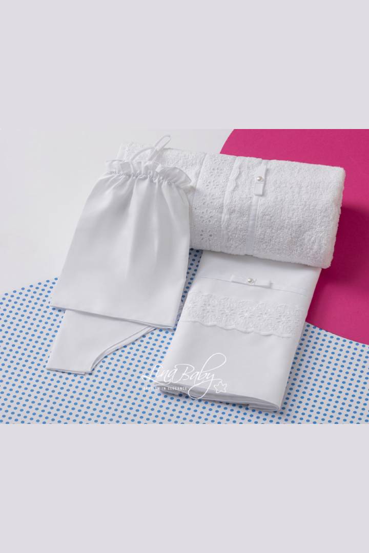Υπέρκομψο βαμβακερό σετ λαδόπανων σε λευκό χρώμα, με Broderie Anglais Εntredeux τρέσα και βαμβακερή κορδέλα με φιογκάκι και πέρλα.