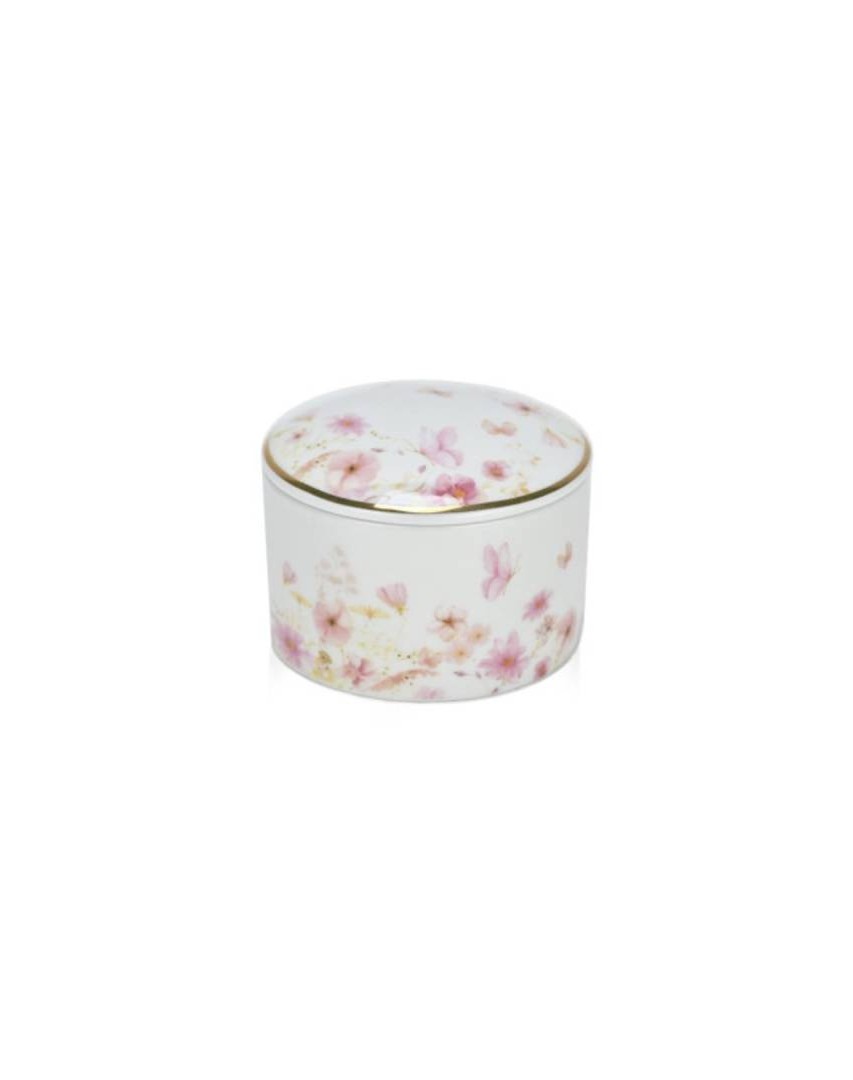 Η πορσελάνινη μπιζουτιέρα με ροζ λουλούδια αποπνέει ρομαντισμό και κομψότητα. Διακοσμημένη με απαλά ροζ άνθη και πεταλούδες, φέρνει την αίσθηση της άνοιξης σε κάθε χώρο.