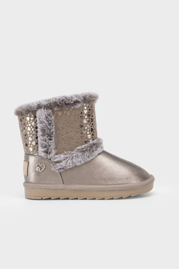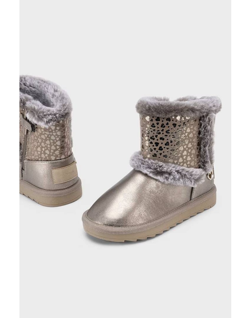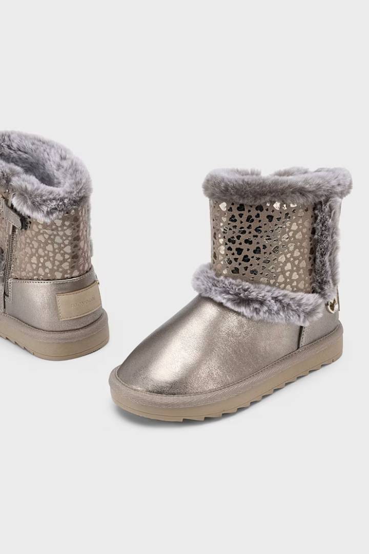 Μποτάκια για κορίτσι απαραίτητα για τη χειμερινή σεζόν. Εξαιρετικά πρακτικά και ζεστά, ιδανικά για τη χειμερινή σεζόν. Δερμάτινο εφέ εξωτερικά. Ελαφριά και εύκαμπτη σόλα. Κλείνει με φερμουάρ στο πλάι για να φοριέται πιο εύκολα και γρήγορα. Διακοσμητική λεπτομέρεια γουνάκι. Μεταλλιζέ λεπτομέρεια.