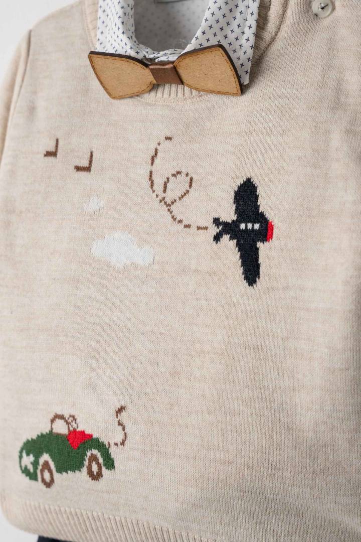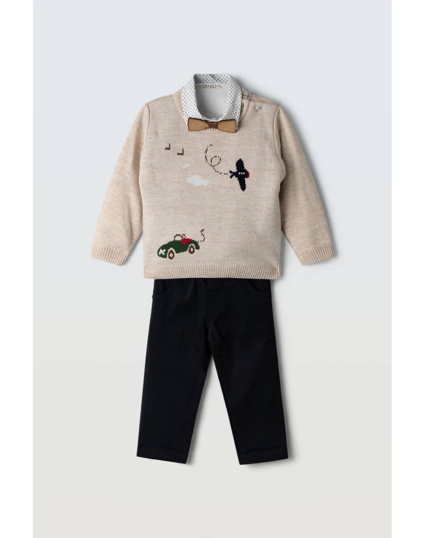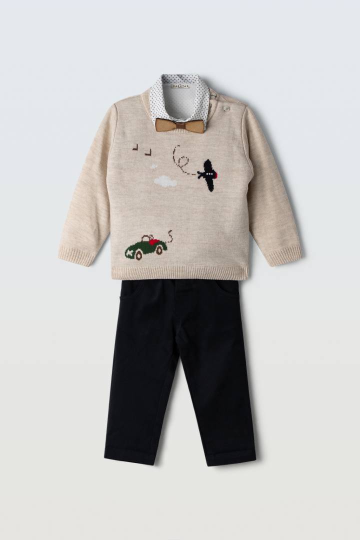 Σετ 3 τεμαχίων Hashtag. Αποτελείται από παντελόνι καπαρντινέ, πουκάμισο σταμπωτό και πουλόβερ με σχέδιο. Αξεσουάρ το ξύλινο παπιγιόν.