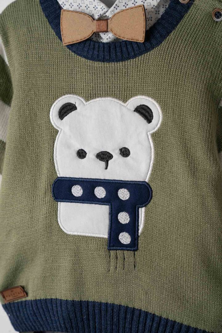 Βρεφικό σετάκι 3 τεμαχίων Hashtag. Αποτελείται από πουκάμισο, πουλόβερ με αρκουδάκι και γκρι παντελόνι με τιράντες.