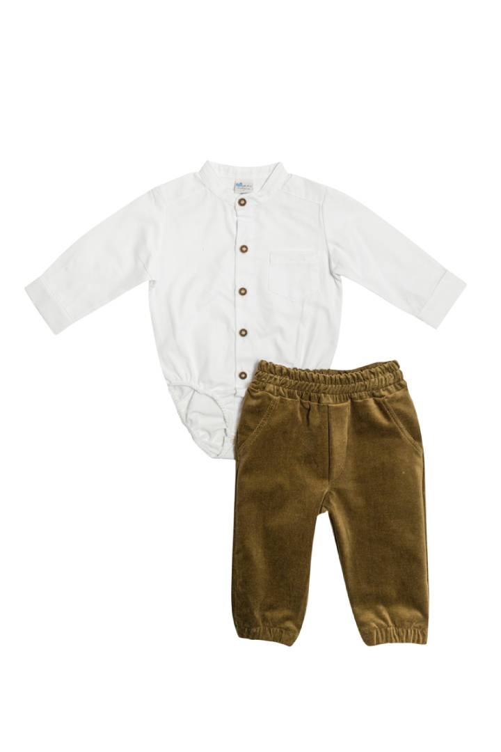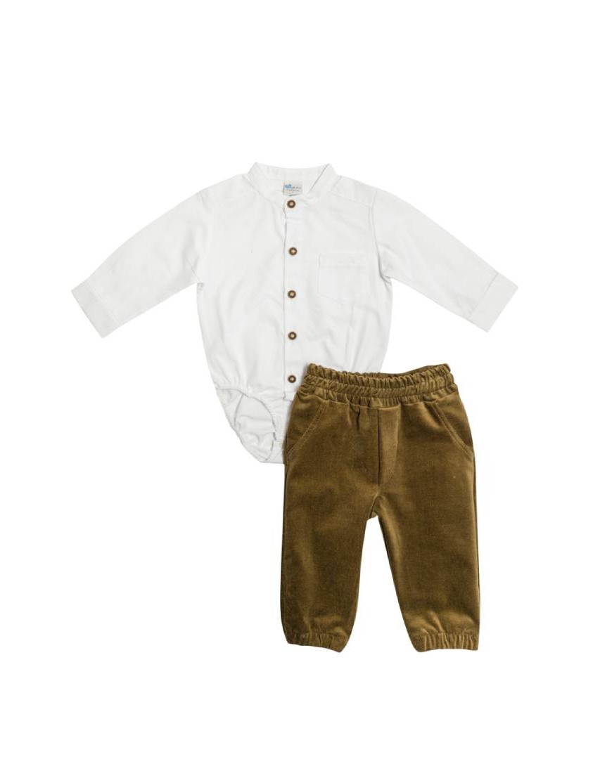Βρεφικό σετ με παντελόνι βελούδο λαδί και πουκάμισο κορμάκι.