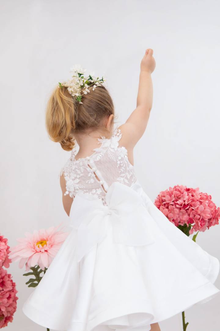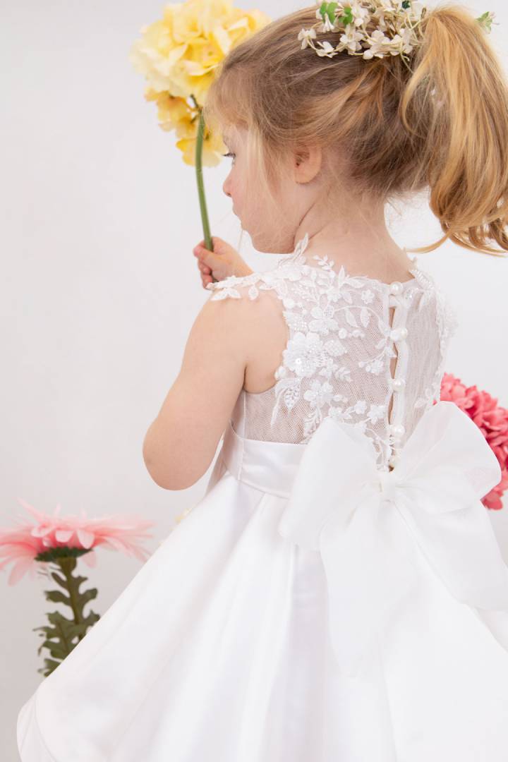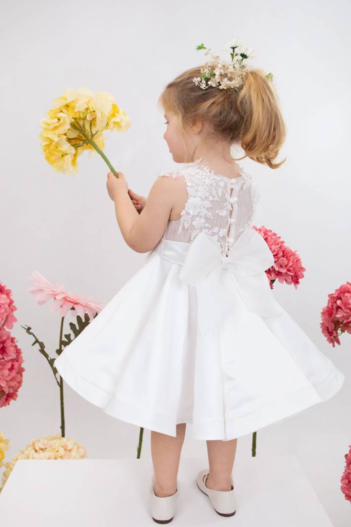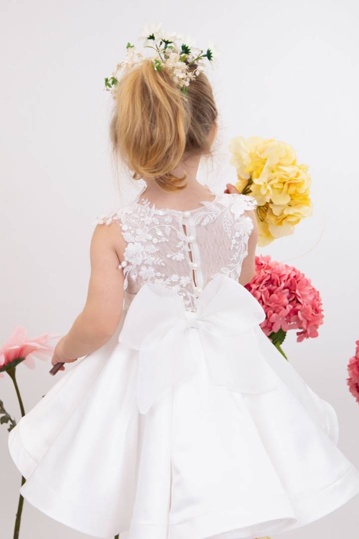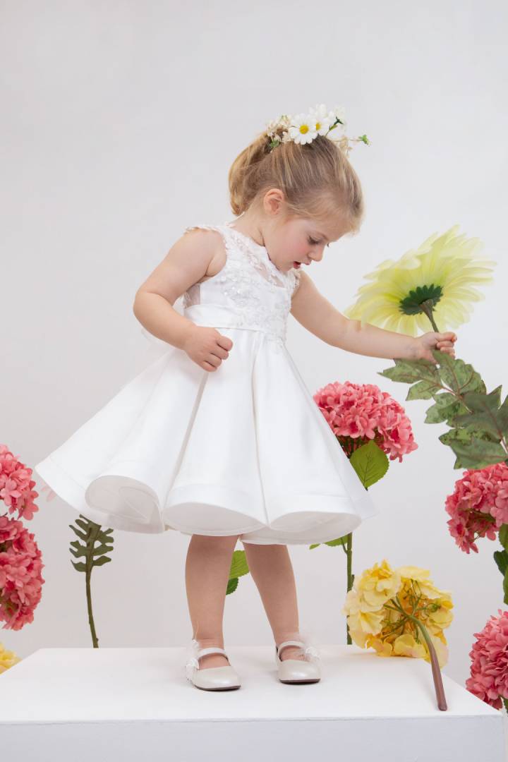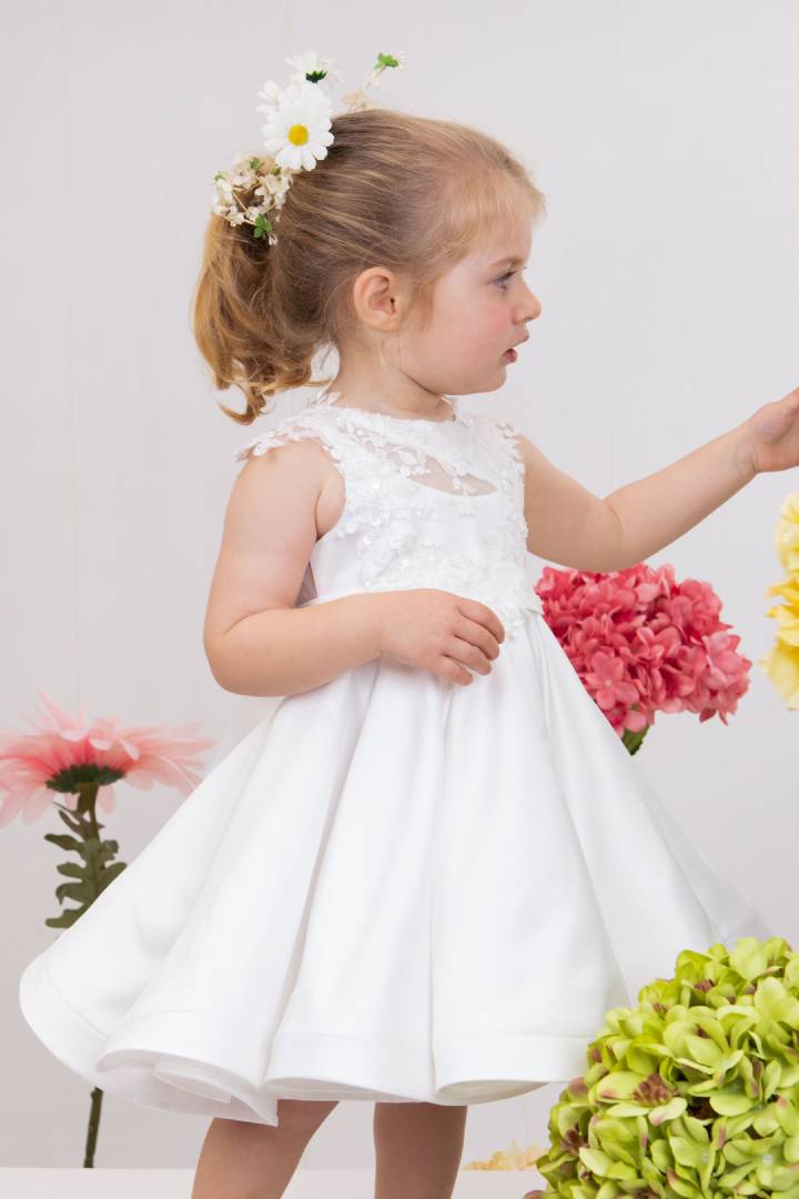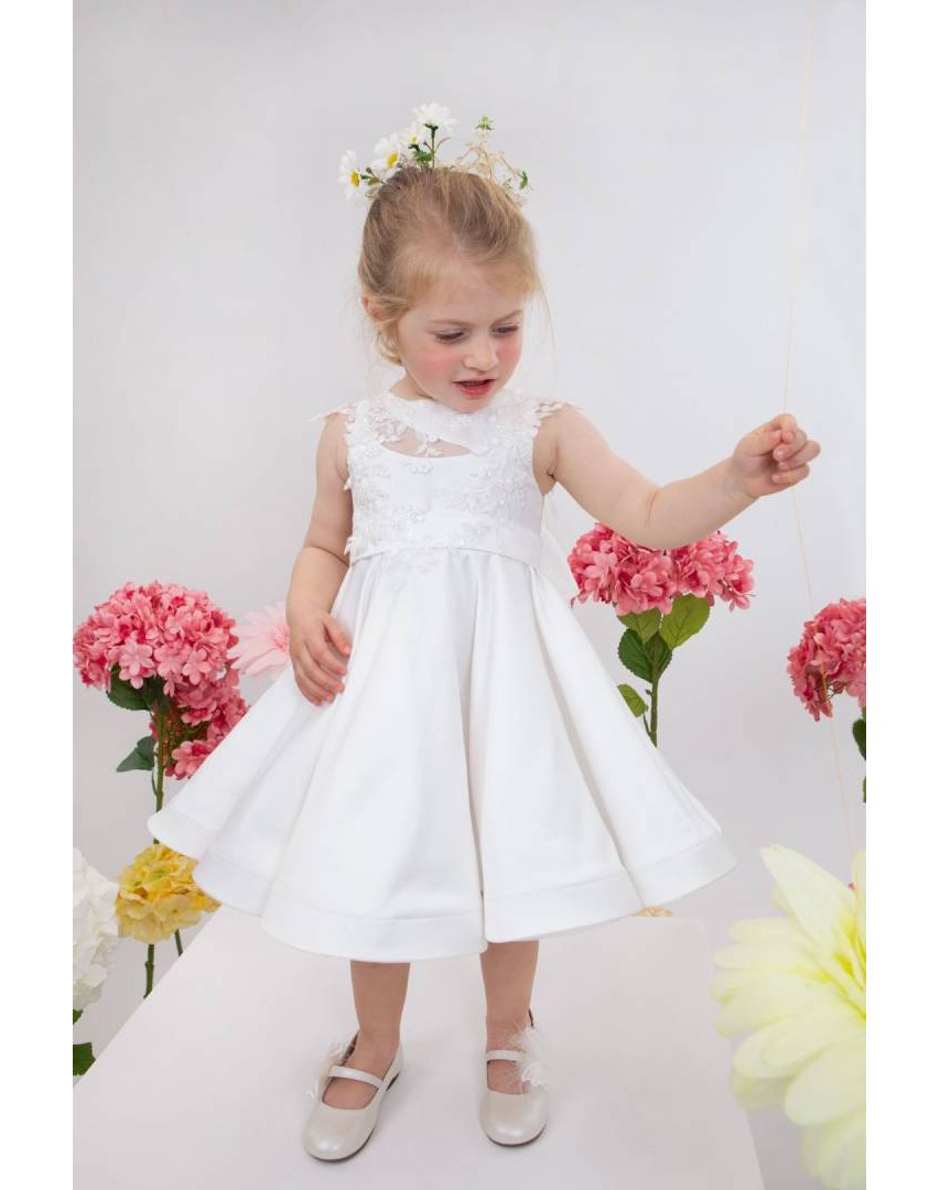 Η Demi είναι ένα εκρού σατέν φόρεμα βάπτισης με φούστα στυλ closs εξαιρετικής ποιότητας. Στο μπούστο στολίζεται με κηπούρ δαντέλα κεντημένη με κρυστάλλους που δίνουν μια glam νότα στο